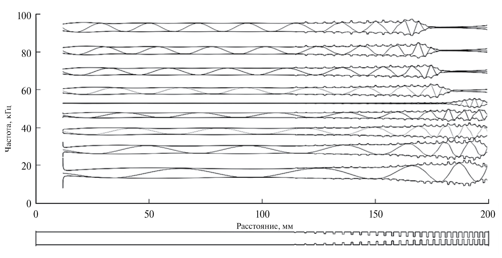 Для разрезного стержня была построена серия распределений нормированной амплитуды смещения изгибной горизонтальной моды вдоль образца в зависимости от расстояния до свободного торца стержня с огибающими, повторяющими профиль разрезного стержня (рис. 5). С помощью преобразования Гильберта были рассчитаны функции, ортогональные исходным модам, и восстановлены формы огибающих для этих мод. По оси ординат отложены частоты, при этом ноль амплитуды колебаний моды соответствует значению ее собственной частоты. Амплитуды нормированы на начальное значение каждой кривой. Под осью абсцисс изображен профиль разрезного стержня.