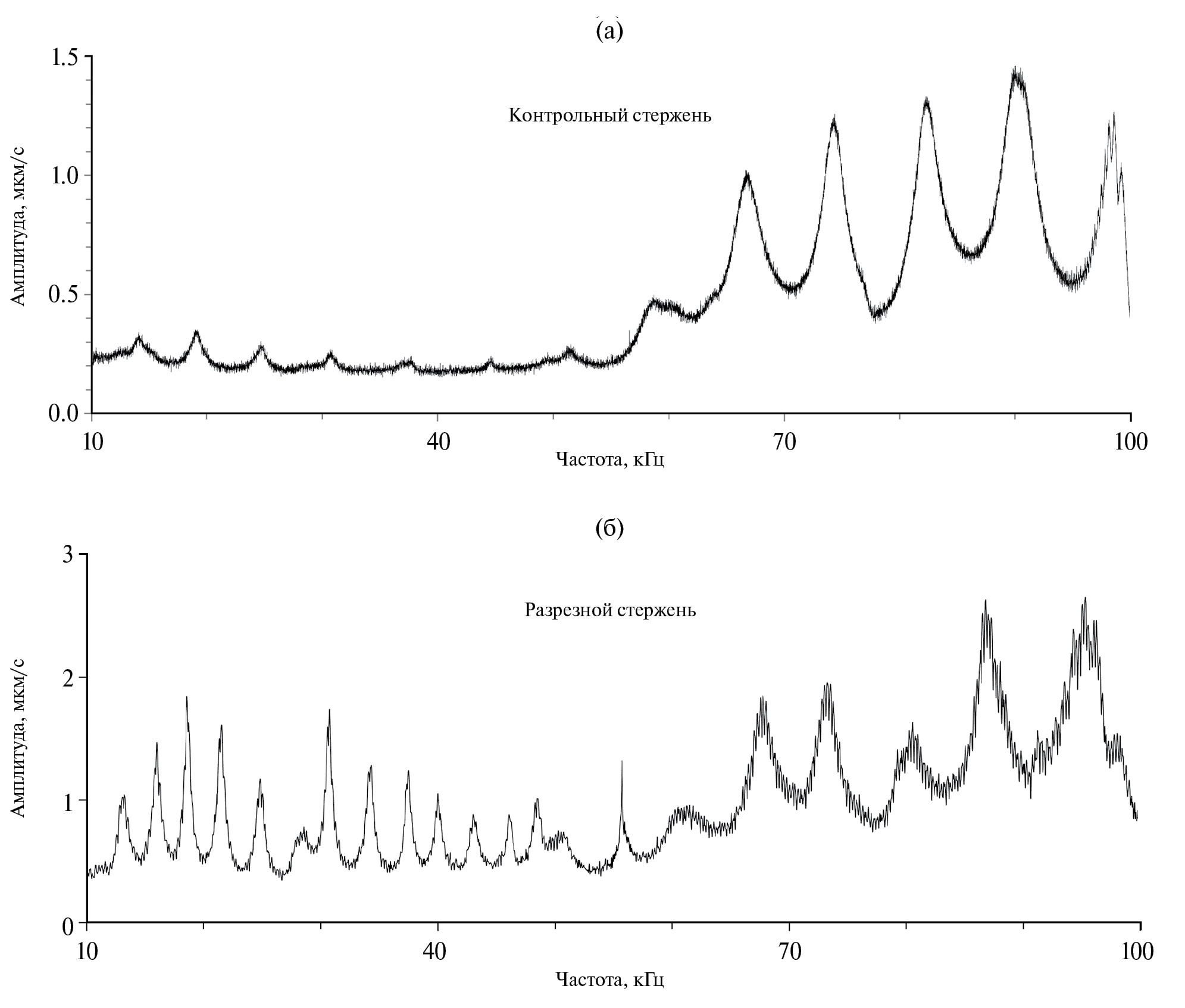 Рис. 9. Амплитудно-частотная характеристика (а) — контрольного и (б) — разрезного стержней в диапазоне от 10 до 100 кГц.