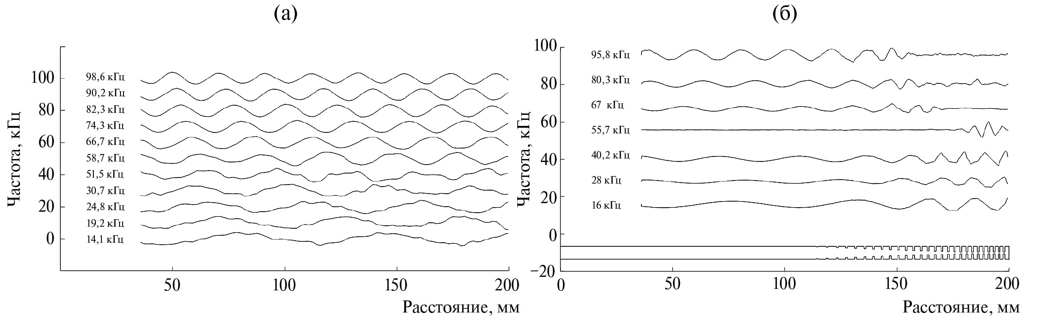 Рис. 6а отображает спектры собственных частот контрольного и разрезного стержней в диапазоне до 100 кГц. Спектр разрезного стержня более насыщен, чем спектр контрольного образца. Это объясняется тем, что по мере приближения изгибной волны к торцу разрезного стержня длина волны уменьшается (рис. 6б), и на участке с прорезями укладывается большее число длин волн для похожей частоты (см. рис. 3).