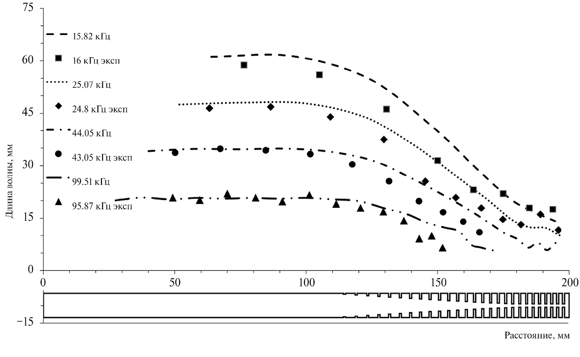 Для всех исследованных частот наблюдается уменьшение длины изгибной волны в стержне в зависимости от пройденного расстояния. Однако, на расстоянии около 30 мм от торца, уменьшение длины волны практически не происходит и даже наблюдается немонотонное поведение длины волны в зависимости расстояния, что связано с тем, что данный образец стержня имеет 5 одинаковых по глубине прорезей на конце. Расхождение результатов моделирования и результатов экспериментальных исследований может быть связано с неточностью изготовления стержня (в том числе выполнения прорезей), неправильного учета места и способа закрепления.