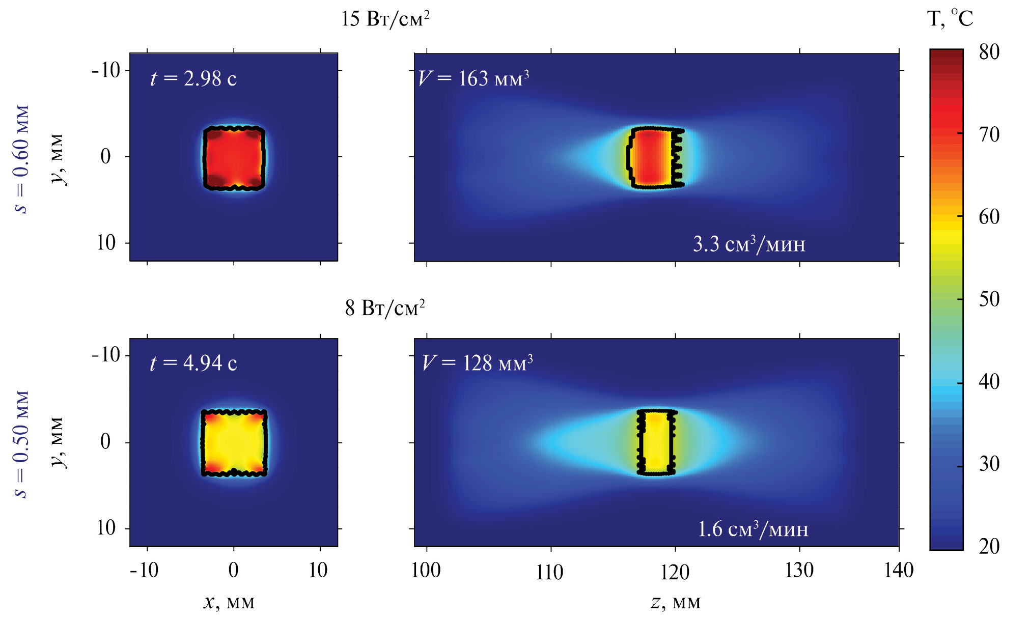 По результатам моделирования для каждого протокола облучения были рассчитаны объем разрушения V и скорость тепловой абляции. Объем разрушения определялся после остывания образца по пороговому значению тепловой дозы, скорость абляции рассчитывалась как отношение объема разрушения ко времени облучения. Время остывания в каждом режиме облучения определялось моментом прекращения увеличения размеров разрушения за счет продолжающейся после окончания воздействия диффузии тепла.