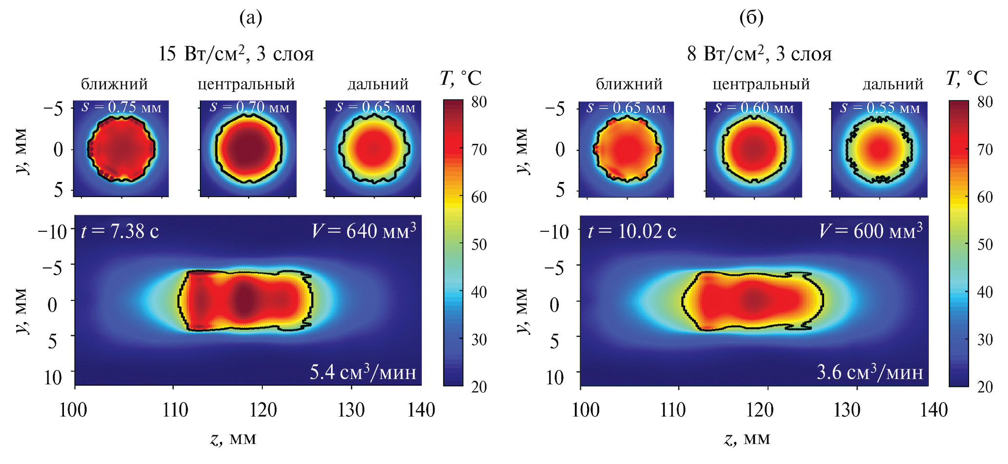 Рис. 4. Пространственные распределения температуры в момент окончания нагрева t (а) — при ударно-волновом облучении образца печени в режиме насыщения (I₀ = 15 Вт/см²) и (б) — в режиме формирования развитого разрыва (I₀ = 8 Вт/см²) по трехслойной траектории. Расстояние между соседними слоями составляло 5 мм, облучение начиналось с дальнего от излучателя слоя. Черным контуром обозначена область, внутри которой тепловая доза превысила свое пороговое значение после остывания образца. В верхнем ряду показаны распределения в фокальной плоскости для каждого из слоев, а в нижнем ряду — распределение в аксиальной плоскости. На распределениях обозначены межфокусные шаги s в каждом слое, длительность облучения t, достигнутые скорости тепловой абляции и объемы полученных разрушений.