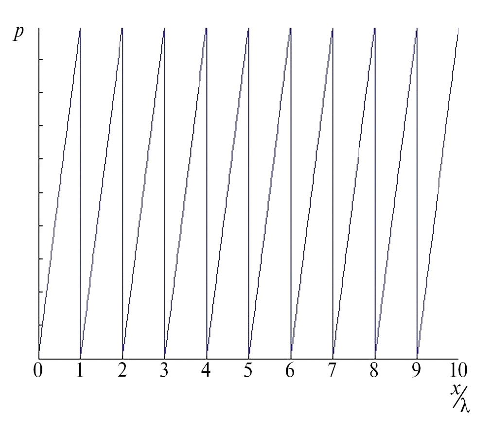 где – возмущение давления, c — скорость звука в невозмущенной среде и ρ0 — плотность, γ — адиабатическая постоянная. Отметим, что в настоящей работе речь идет именно о периодической системе скачков уплотнения, которые повторяются с каждым оборотом вентилятора. Это существенно отличает рассматриваемый случай от работ о распространении нескольких последовательных ударных волн (см. например [3, 4, 5]).