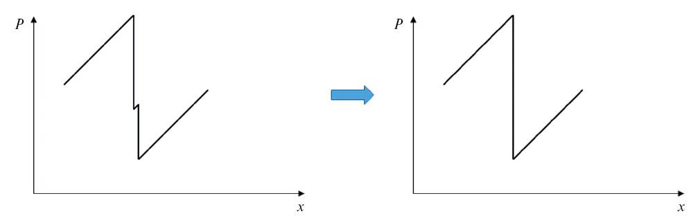 В реальном двигателе лопатки не идентичны и как следствие нерегулярна и структура скачков уплотнения. Для ответа на вопрос об эволюции такой системы скачков применяется подход к решению (1), аналогичный использованному для аналитического решения в случае регулярной системы ударных волн [2]. При распространении каждая точка волны движется со своей скоростью, что приводит к передвижению скачков относительно друг друга, а также затуханию их амплитуды. Когда один из скачков догоняет другой, то происходит их слияние (рис. 3), после которого продолжается распространение сформировавшейся системы волн. Такой кинематический подход позволяет численно получить решение для эволюции нерегулярной системы скачков уплотнения.