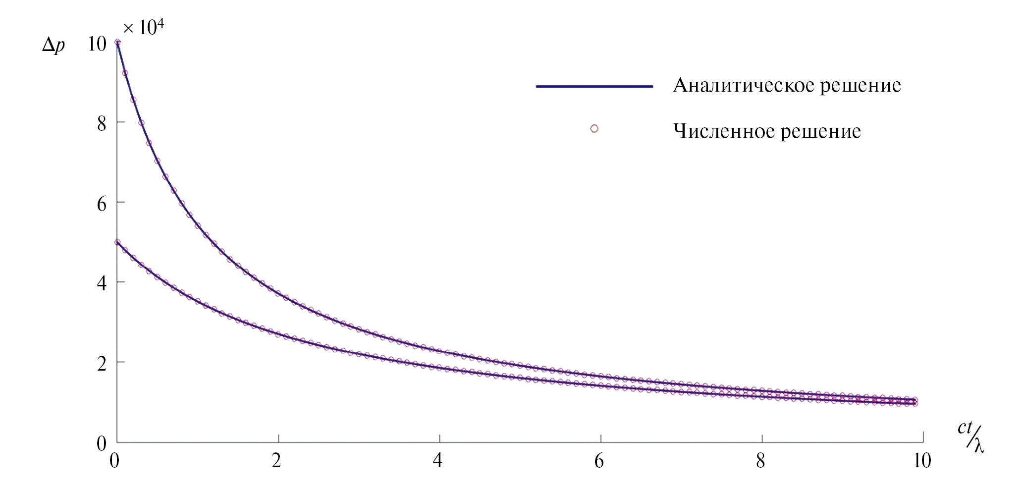 Сначала необходимо удостовериться, что предложенный численный метод совпадает в простейшем случае регулярной системы волн с аналитическим решением. В модельной задаче количество лопаток принимается равным десяти, что приводит к периодической системе из десяти одинаковых ударных волн (см. рис. 2). Сравнение зависимости амплитуд регулярных скачков от времени для аналитического и численного решений для двух различных начальных амплитуд показано на рис. 4.