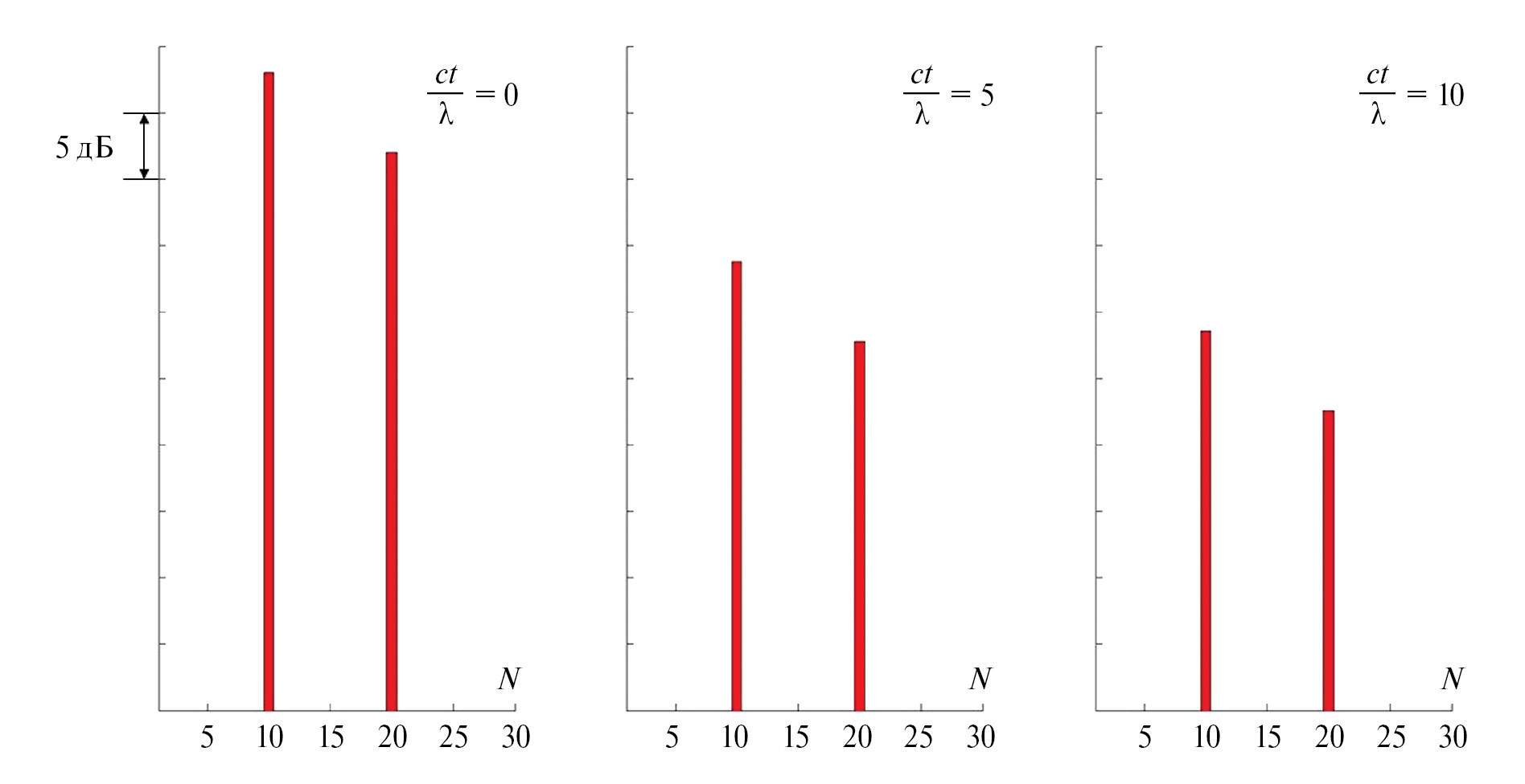 Рис. 5. Эволюция спектра регулярной системы волн ( N – номер гармоники с частотой Nω₀, , T – период вращения вентилятора).
