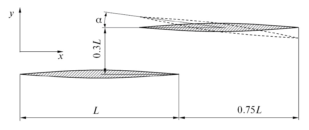 Рис. 8. Схема расположения соседних профилей в модельной решетке. L — хорда профиля. Пунктиром показан профиль под углом атаки α.