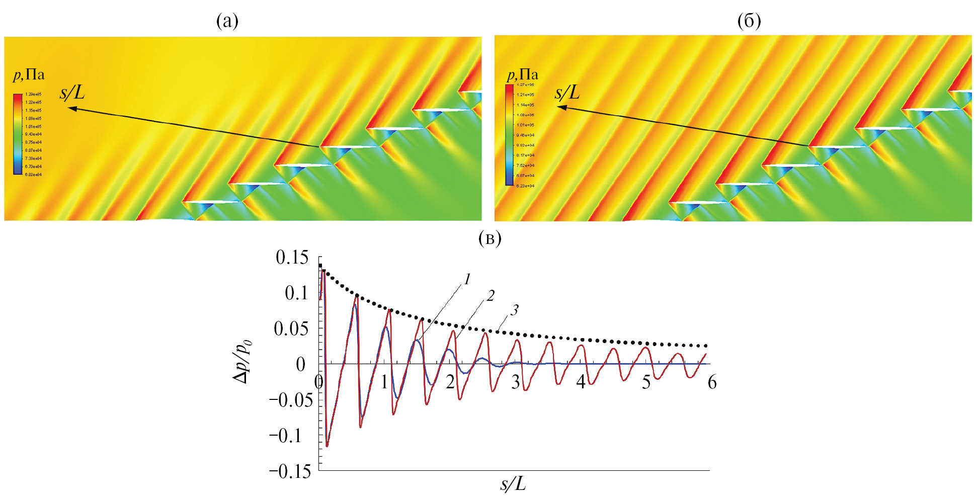 Расчет для регулярной решетки проводился на двух сетках объемом 0.4 и 1.3 млн ячеек соответственно (далее — сетка 1 и сетка 2). Результаты расчетов приведены на рис. 10а, 10б. Как видно, на более грубой сетке 1 скачки уплотнения достаточно быстро затухают (на расстоянии менее 1 хорды от решетки профилей) вследствие диссипативных свойств численной схемы, поэтому такая сетка не пригодна для анализа эволюции ударных волн по мере удаления от решетки. На рис. 10в показано распределение возмущений давления (относительно p0) вдоль линии распространения возмущений (показана на рис. 10а, 10б), и проведено сравнение с одномерной моделью бегущих пилообразных волн, описанной в разделе 1. Видно, что результаты расчетов на сетке 2 достаточно хорошо соответствуют модели вплоть до удаления s/L ~ 5–6 от решетки, после которого становится заметным размывание скачков на данной сетке. При дальнейшем измельчении расчетной сетки согласие численного решения с теоретической моделью будет иметь место для больших значений параметра s/L, однако для целей настоящей работы точности, полученной на сетке 2, оказалось достаточно.