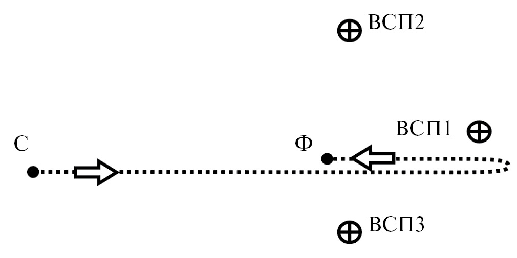 Рис. 1. Схема движения АНПА (пунктир) относительно расположения ВСП, С – точка старта, Ф – точка финиша.