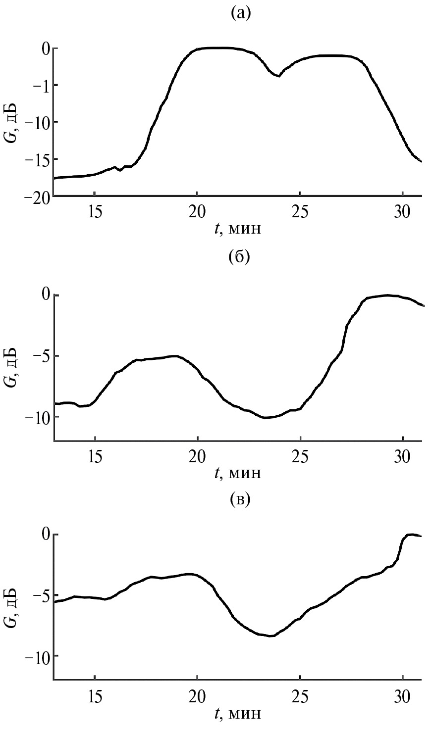 Рис. 10. Временная зависимость пеленга (t): (а) — ВСП1, (б) — ВСП2, (в) — ВСП3.