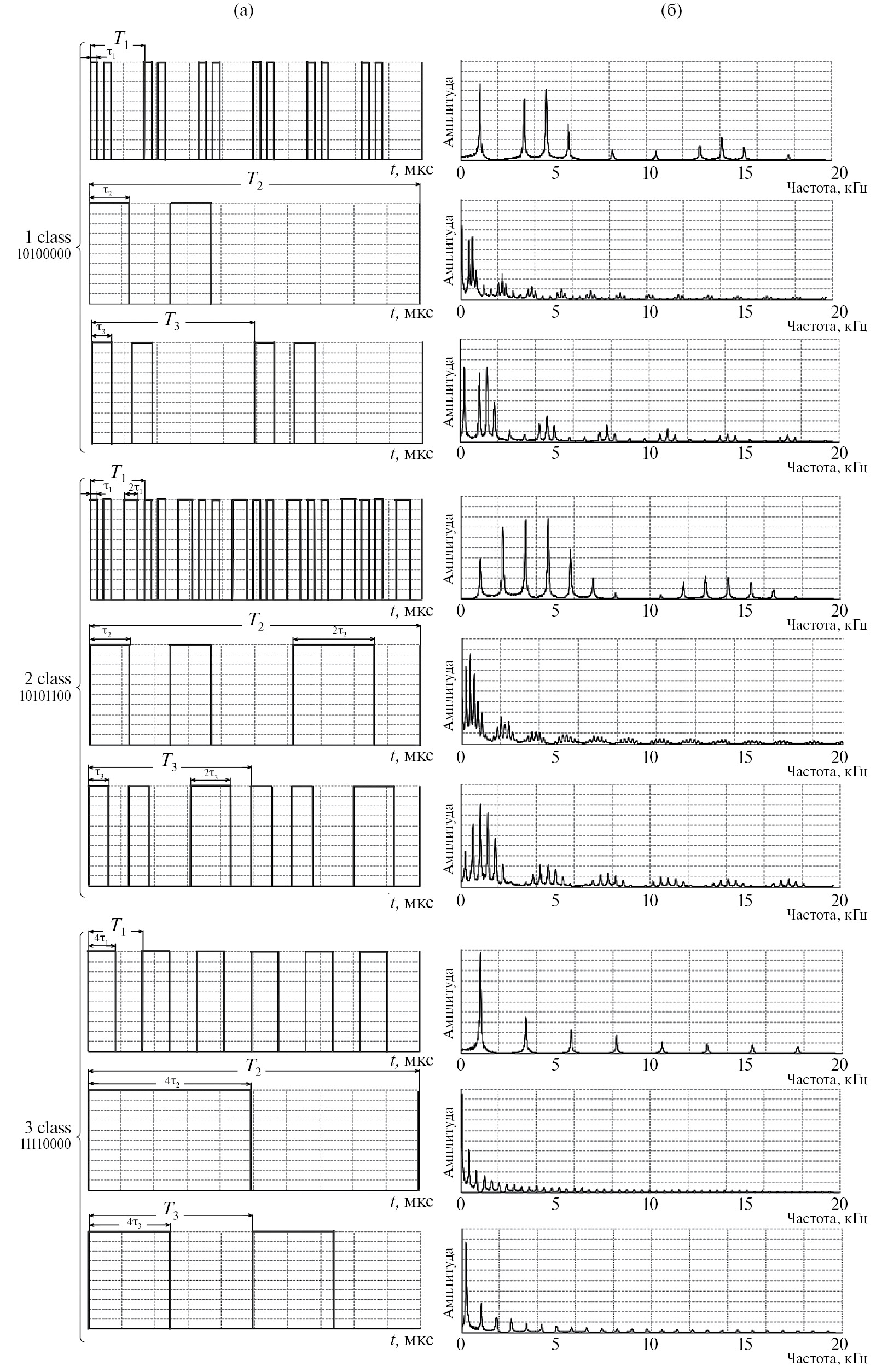 Рис. 1. Временная и спектральная структуры сигналов. (a) — Временная структура сигналов. T — период следования группы импульсов в последовательности. T₁ = 736 мкс, T₂ = 4480 мкс, T₃ = 2080 мкс. τ — минимальная длительность одного импульса в каждом режиме работы: τ₁ = 92 мкс, τ₂ = 560 мкс, τ₃ = 260 мкс (Т = 8τ). (б) — Спектральная структура сигналов. По оси абсцисс — частота, по оси ординат — амплитуда спектральных составляющих.