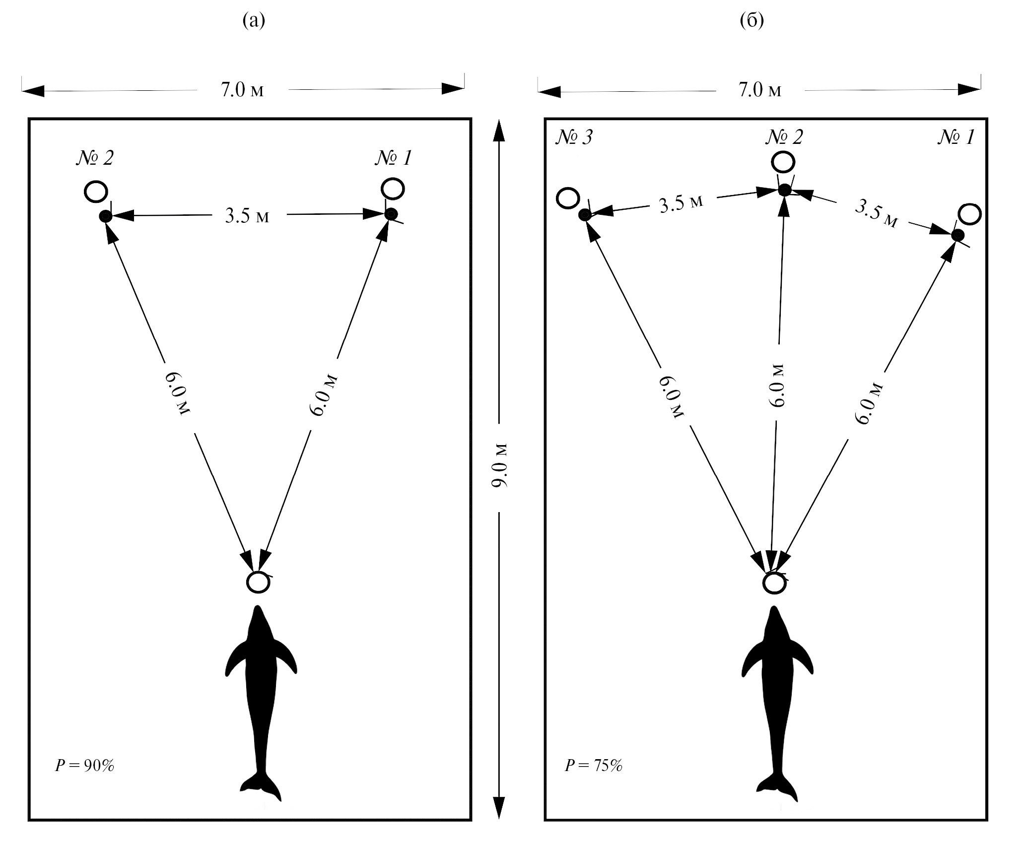 На следующем этапе исследования, после адаптации животных к усложнению задачи и оценки эффективности их работы в условиях альтернативного пространственного выбора на фоне шумовой помехи, пространственная неопределенность была увеличена введением третьей пары сигнального и помехового гидрофонов, расположенных на том же расстоянии и с таким же разнесением относительно предыдущих пар гидрофонов (рис. 2б). Дельфин должен был идентифицировать источник сигналов положительного класса, которые могли подаваться в случайном порядке на любой из трех расположенных в вольере сигнальных гидрофонов при одновременной подаче на другие сигнальные гидрофоны шумов отрицательных классов.