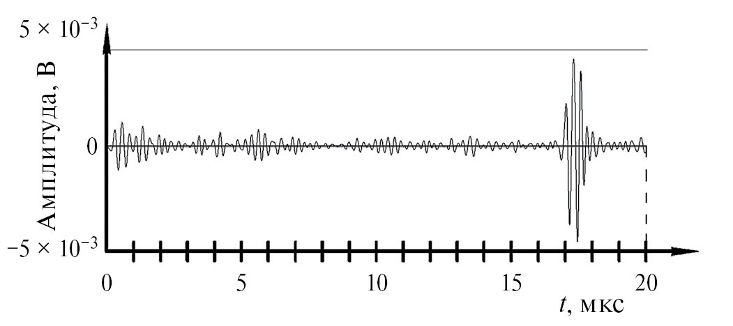 Сказанное иллюстрируется рис. 1, на котором приведена типичная реализация донного сигнала (рис. 2) и обратно рассеянного структурного шума (рис. 3) для одного из исследуемых в данной работе образцов из стали Х12МФ, изготовленных методом ГИП, со степенью пористости 9 %.