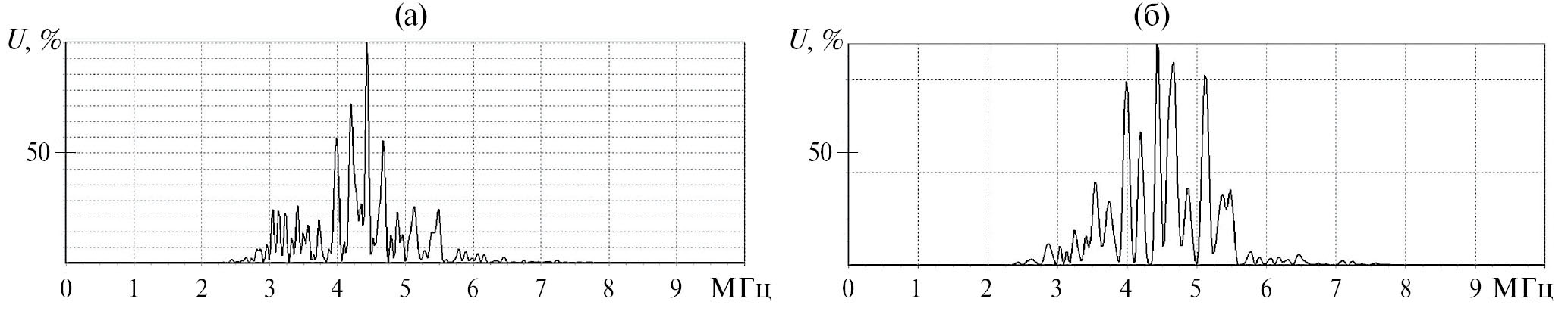Рис. 2. Энергетические спектры донного импульса: (а) — прямоугольное окно, (б) — окно Хэмминга