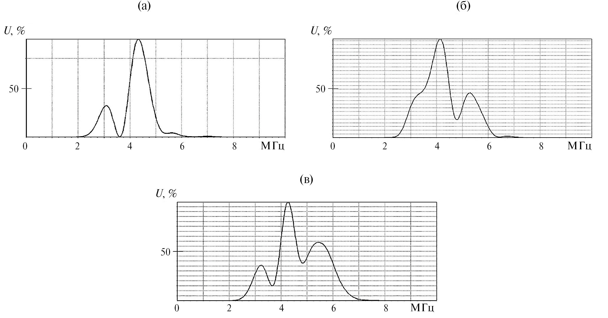 На рис. 7 приведены энергетические спектры СШ, полученные при одной установке преобразователя (рис. 7а) и при вращении преобразователя вокруг вертикальной оси с угловым интервалом α = 15° и расчетом энергетического спектра по формуле (8) (рис. 7б). Рис. 7 показывает, что при дополнительном «угловом» усреднении энергетический спектр стал более симметричным. Однако более важным результатом является ожидаемое уменьшение его дисперсии в Nα. Экспериментальная проверка этого вывода приведена ниже.
