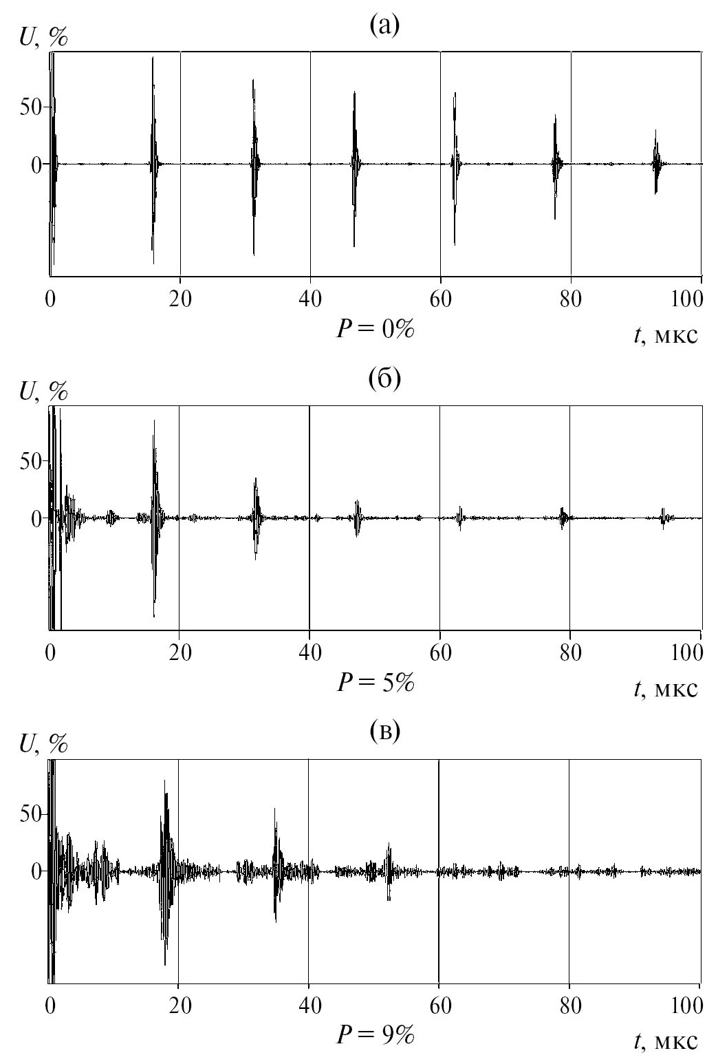 Экспериментальная возможность использования величины относительной энергии СШ для неразрушающей оценки степени пористости проводилась на образцах со степенью пористости от 0 до 9%. На рис. 8 приведены полные осциллограммы сигналов для указанного диапазона пористости. Рис. 8 наглядно показывает существенное влияние пористости на величину структурного шума. При увеличении пористости материала уровень шума, рассеиваемого от пор, увеличивается.