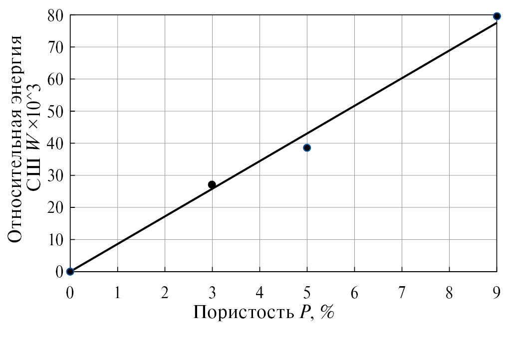Рис. 9. Влияние степени пористости на относительную энергию структурного шума