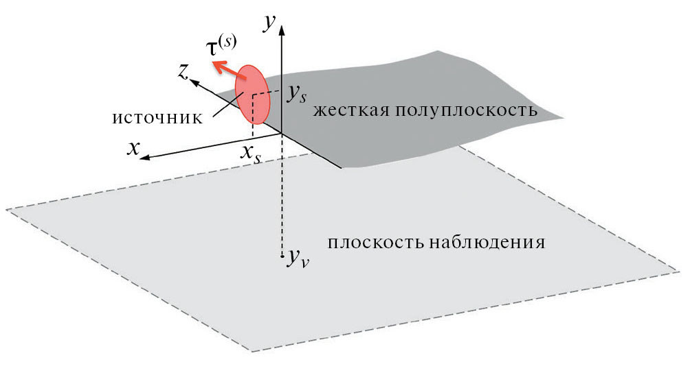 Рис. 1. Иллюстрация геометрии расположения источника вблизи бесконечной полуплоскости и расположение плоскости наблюдения