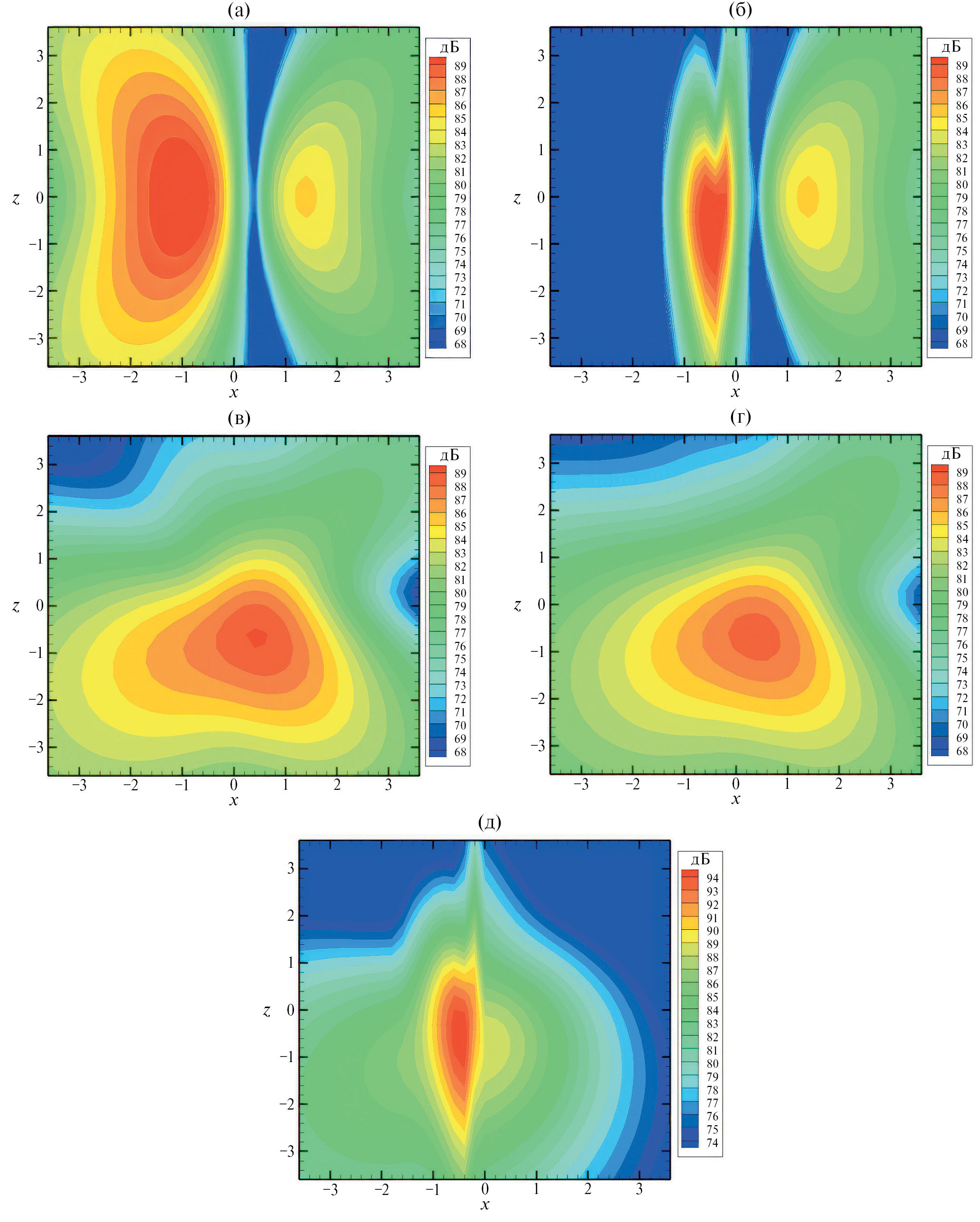 Рис. 2. Распределение мод уровня звукового давления на плоскости наблюдения на частоте f = 400 Гц: (а) — поле изолированного винта при отсутствии экрана при ys = 175 мм; (б) — поле с учетом геометрического экранирования при ys = 175 мм; (в) — суммарное поле от винта с экраном при ys = 175 мм; (г) — суммарное поле от винта с экраном при ys = 200 мм; (д) — дифрагированное поле при ys = 175 мм