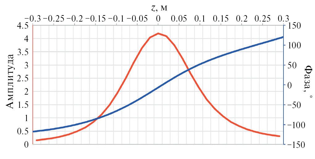 Рис. 3. Распределение амплитуды и фазы дифрагированного звукового поля от координаты zv на линии xv = 0 и yv = –5 мм при ys = 175 мм на частоте f = 400 Гц