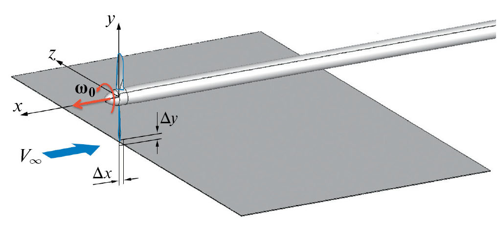 В настоящей работе мы будем интересоваться эффектом боковой асимметрии направленности шума винта в передней полусфере, и поэтому рассматриваем модельную ситуацию, когда двулопастный винт устанавливается перед крылом, но концы его лопастей при вращении проходят в достаточной близости от передней кромки крыла (менее 15% диаметра винта), причем ось винта располагается над поверхностью крыла. Данное взаимное расположение винта и крыла выбрано для того, чтобы усилить эффект острой кромки, которая служит дополнительным источником звука, возникающим из-за необходимости удовлетворения граничных условий на поверхности крыла.