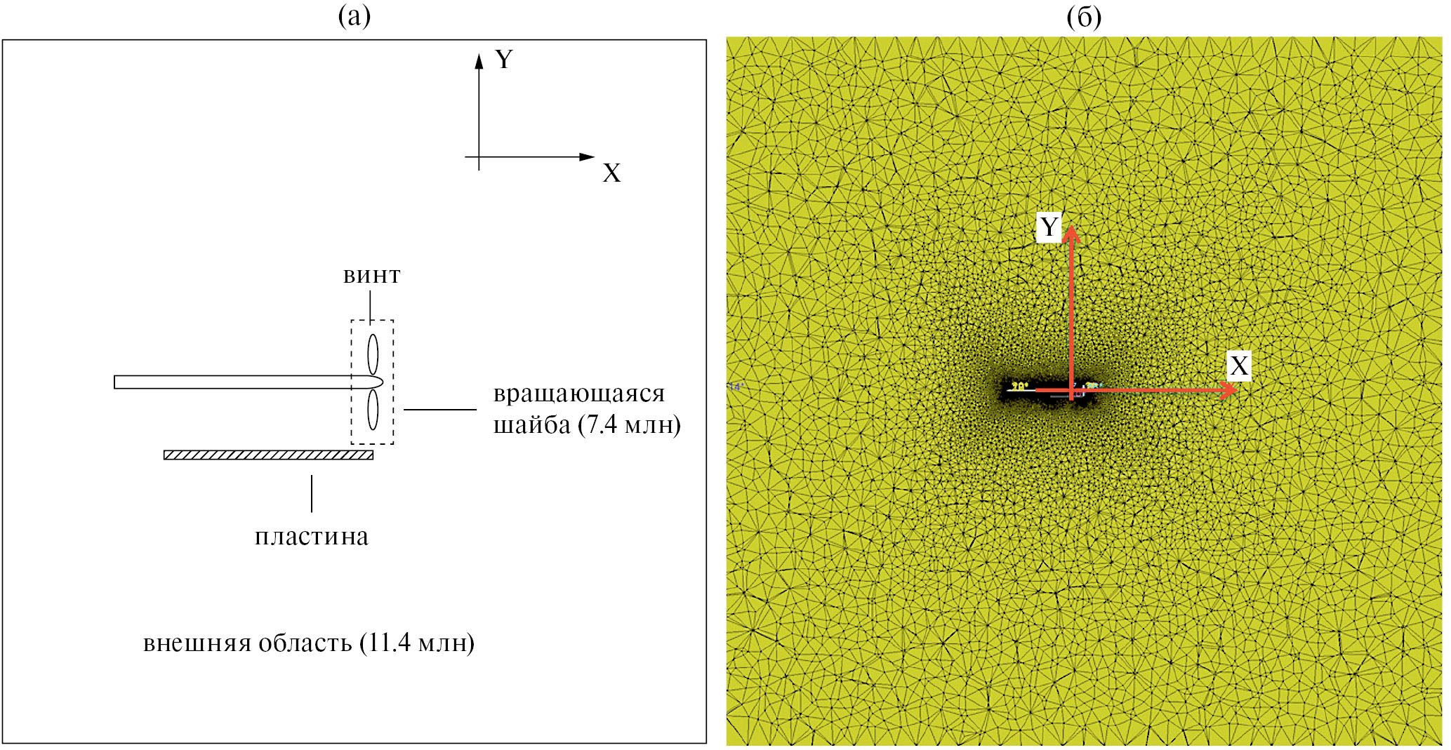 Для изолированного винта и винта с пластиной были построены тетраэдральные расчетные сетки умеренного объема. Каждая сетка состояла из двух областей: внутренней малой цилиндрической области — “шайбы”, заключающей в себе винт (диаметр шайбы составлял 1.05D, высота — 0.1D), которая могла вращаться с заданной угловой скоростью, и внешней неподвижной цилиндрической области (диаметр и высота составляли 66.7D), охватывающей шайбу (рис. 7а). Размеры шайбы были выбраны таким образом, чтобы пластина полностью находилась во внешней области, что позволяло для расчетов изолированного винта и винта в компоновке использовать одну и ту же шайбу.
