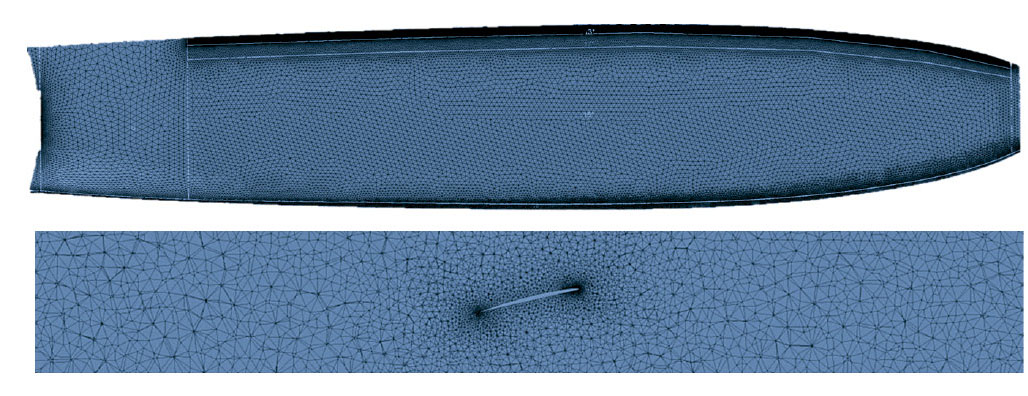 Рис. 8. Вверху — поверхностная сетка на лопасти, внизу — сечение лопасти и шайбы плоскостью на радиусе r / R = 0.8