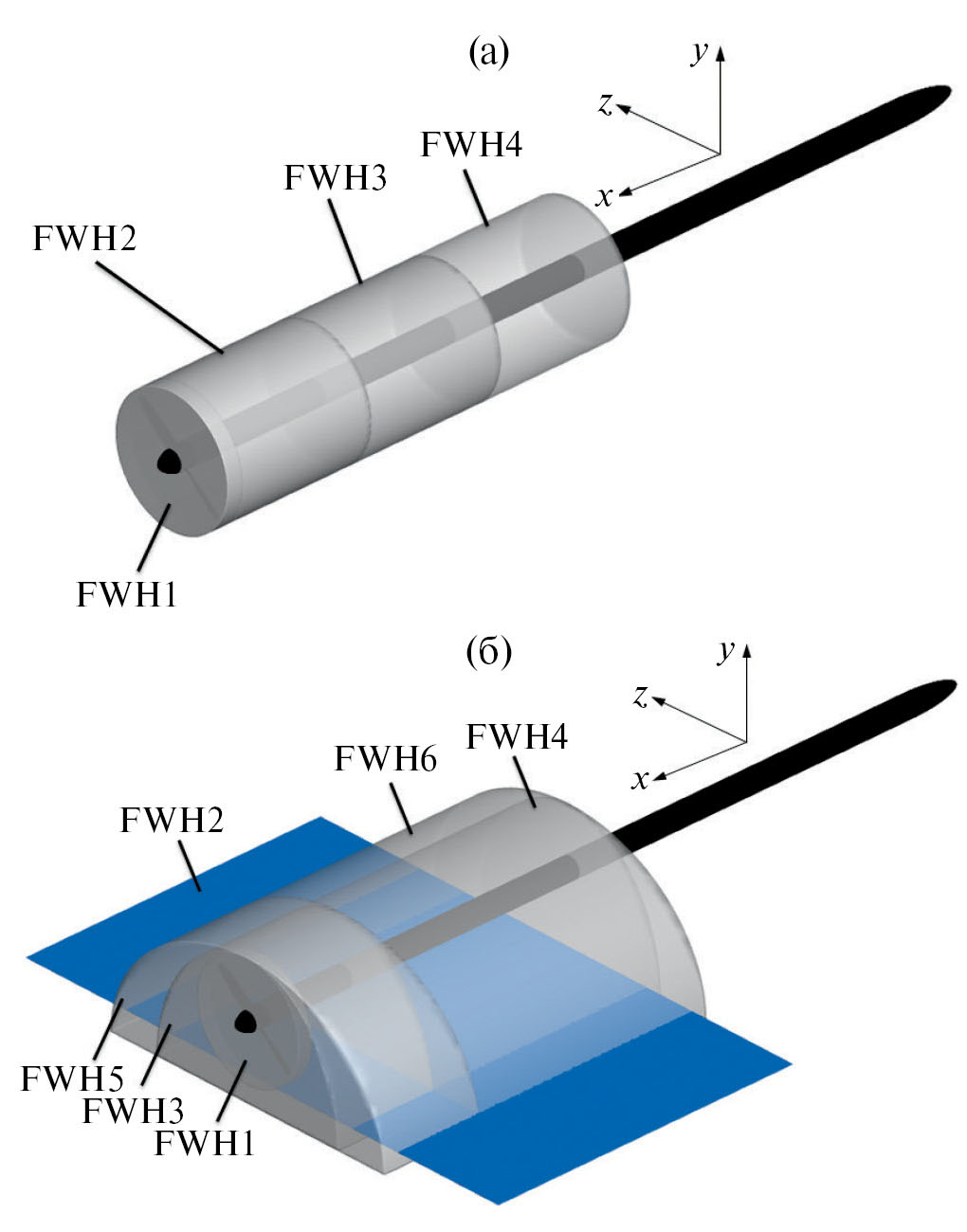 Рис. 9. Контрольные FWH-поверхности для расчета шума: (а) — изолированный винт; (б) — винт с пластиной