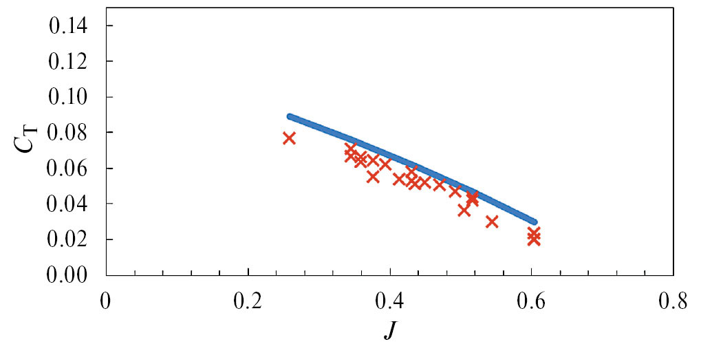 Рис. 10. Зависимость коэффициента тяги винта от относительной поступи, линия — данные численного моделирования; маркеры — эксперимент в АК-2