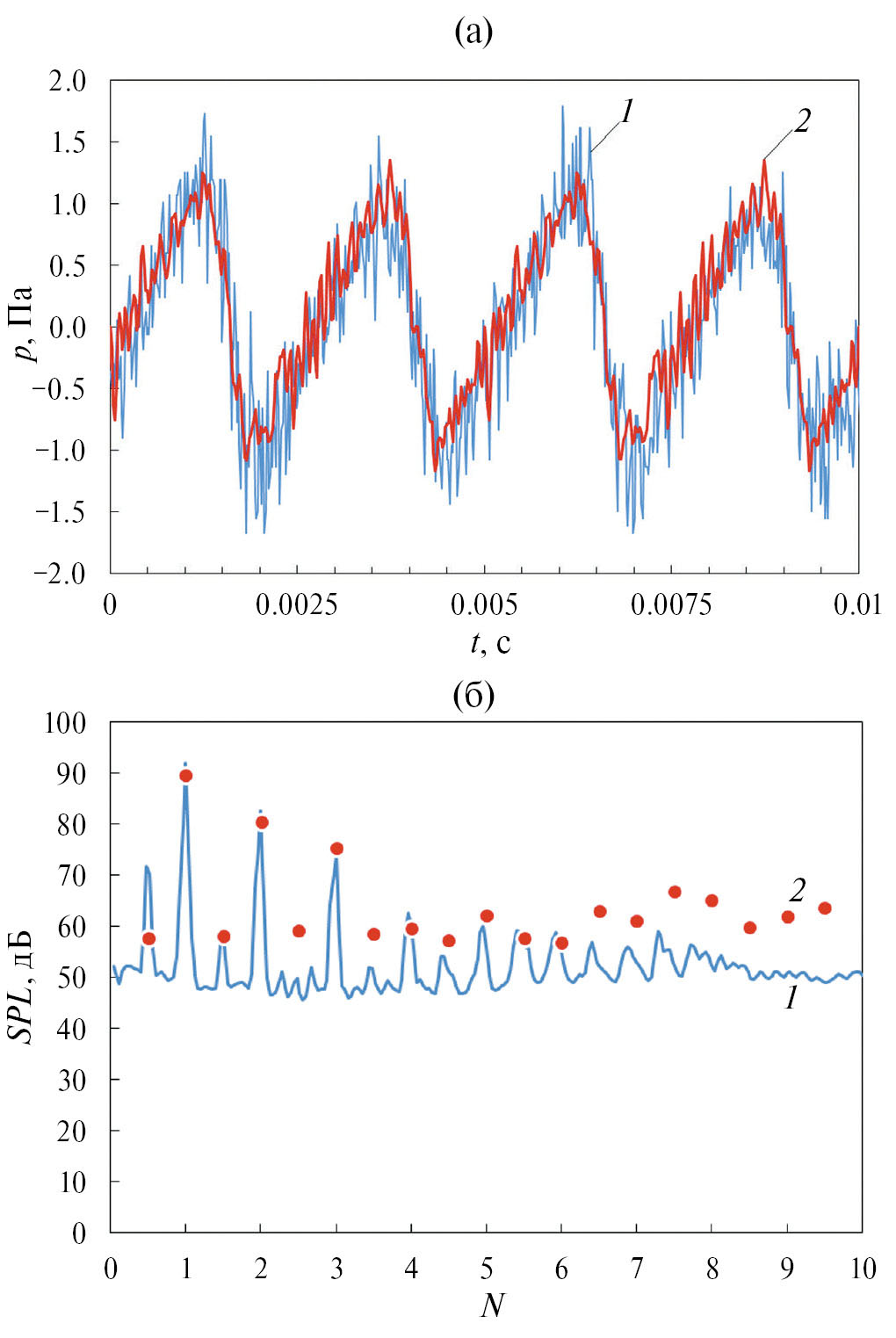 Рис. 11. Характеристик шума винта для θ = 95°: (а) — временная развертка давления в течение двух оборотов винта; (б) — спектры шума. 1 — эксперимент, 2 — расчет
