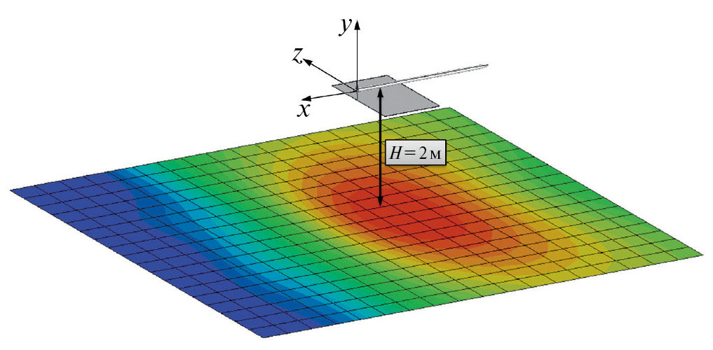 Таким образом, проведенное сравнение с результатами измерений в заглушенной камере показывает, что используемый численный метод адекватно воспроизводит основные аэродинамические характеристики винта и излучаемый им тональный шум. В дальнейшем для случая с пластиной будет анализироваться поведение основной тональной компоненты шума на частоте fBPF = 400 Гц (для этой же частоты в разделе 1 были проведены теоретические оценки). Поскольку с точки зрения проблемы шума на местности, основной интерес представляет излучение в нижнюю полусферу, данные для анализа влияния пластины на шум винта выводились, как и в разделе 1, на плоскости, параллельной плоскости пластины и удаленной на расстояние H = 2м = 6.67 D от оси винта, как показано на рис. 13. Диапазон вывода данных в плоскости составлял −12D ≤ x, z ≤ 12D (от –3.6 м до 3.6 м).