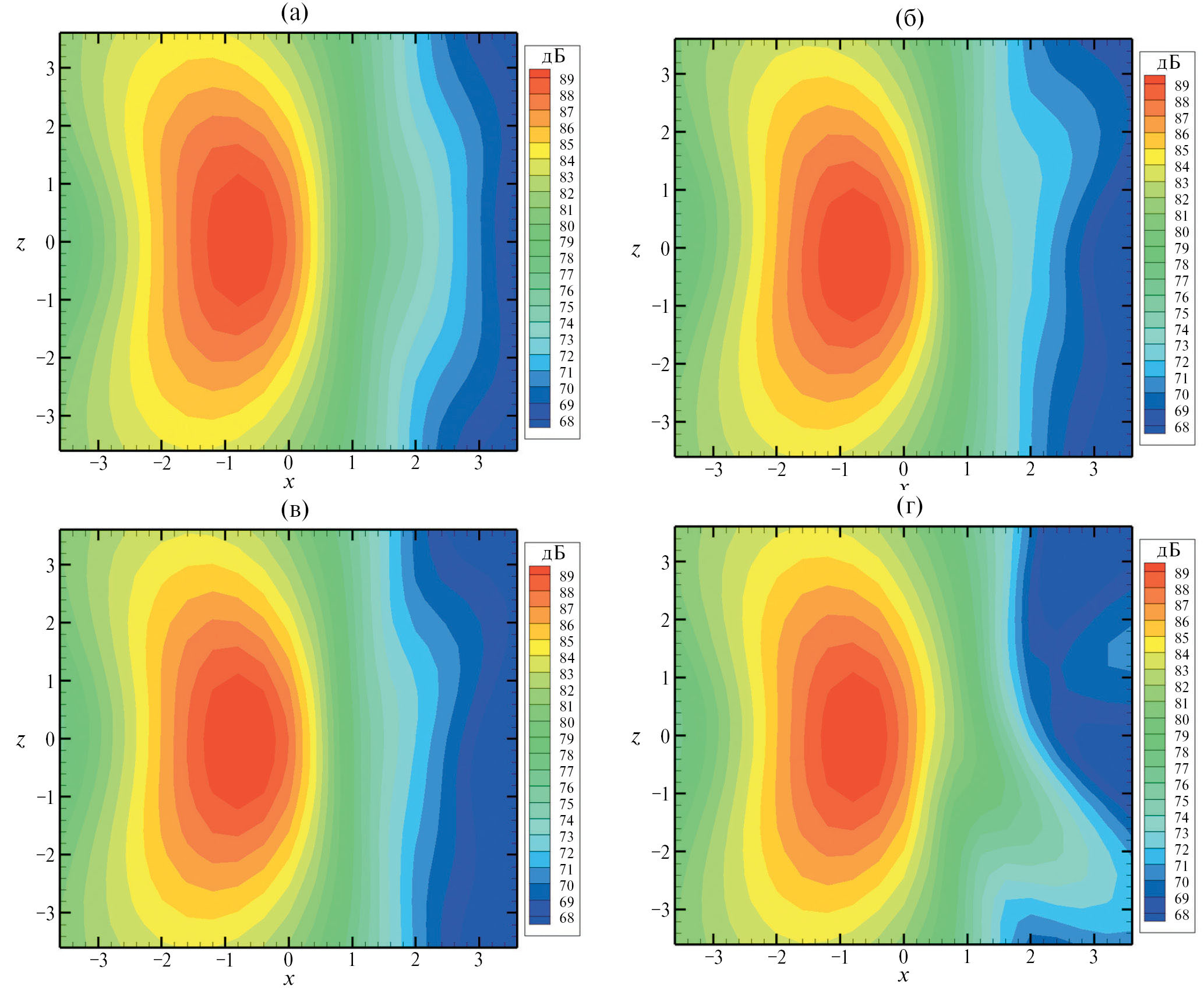 Рис. 14. Распределения уровня (в дБ) основной гармоники тонального шума изолированного винта, полученные с использованием различных контрольных поверхностей: (а) — FHW1; (б) — FWH2; (в) — FWH3; (г) — FWH4