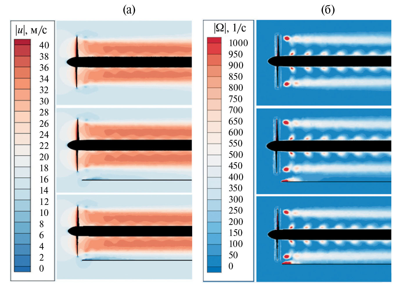 Рис. 15. (а) — Сравнение мгновенных полей продольной скорости и (б) — модуля завихренности для одиночного винта и винта с пластиной при ∆y = ∆x и ∆y = 2∆x (сверху вниз)