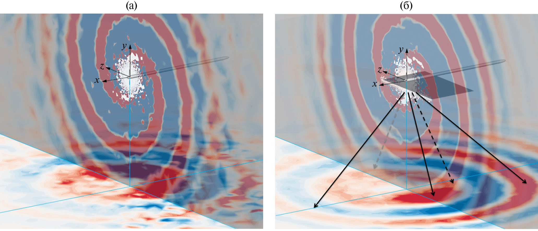 Рис. 16. Мгновенные поля div V: (а) — изолированный винт; (б) — винт с пластиной ∆y = ∆x, сплошными стрелками показаны направления усиления шума, пунктирными — ослабления шума по сравнению с изолированным винтом