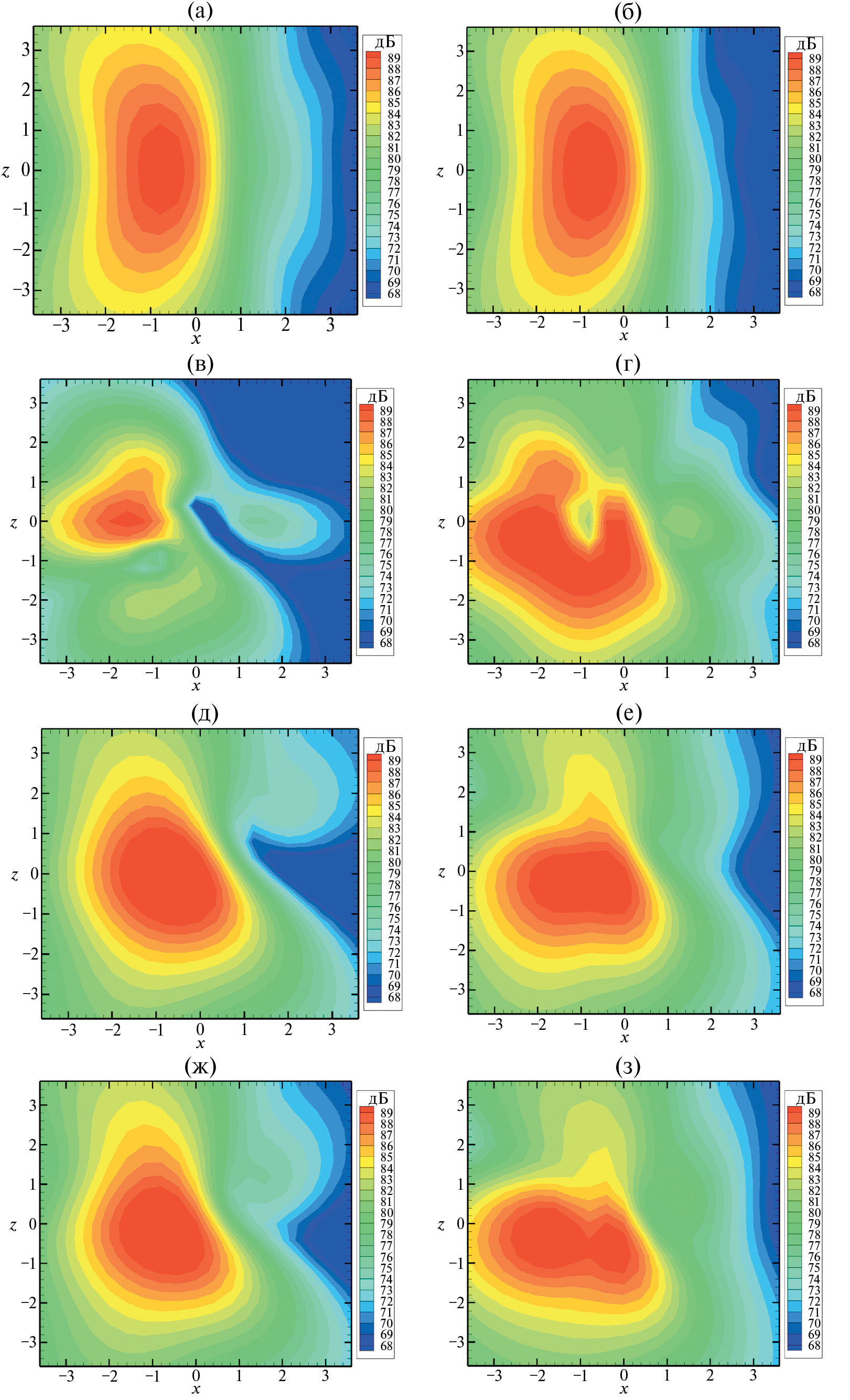 Проведем далее более детальный количественный анализ структуры звукового поля на плоскости наблюдения для наиболее близкого расположения винта и пластины Δy = Δx. На рис. 17 приведены результаты для изолированного винта (рис. 17а) и винта с пластиной (рис. 17б-17з), полученные с использованием различных контрольных поверхностей. Как видно из сравнения рис. 17а и рис. 17б, расчет по поверхности FWH1, охватывающей винт и не охватывающей пластину, дает достаточно точную оценку шума винта даже в случае наличия пластины, что является следствием слабого влияния пластины на аэродинамические характеристики винта. На рис. 17в показан результат расчета звукового поля от пластины (поверхность FWH2). В силу линейности задачи суммарный шум системы “винт-пластина” складывается из суммы звукового излучения винта и пластины — соответствующий результат приведен на рис. 17г. Как видно, результирующее звуковое поле оказывается существенно асимметричным, что качественно согласуется с результатами теоретической оценки, приведенной в разделе 1. Однако наблюдается достаточно сильное количественное различие между упрощенной моделью и расчетом. Так, в расчете структура звукового поля при наличии пластины оказывается существенно более сложной: можно видеть две зоны максимума шума при x ≈ –2 м, z ≈ –0.5 м и при x ≈ 0 м, z ≈ –1 м. Причин такого расхождения может быть несколько: конечность размеров пластины и существенный вклад задней и боковых кромок, упрощенный характер модели шума винта (без учета шума вытеснения и реального распределения нагрузки по лопасти), отсутствие в теоретической модели набегающего потока. Так, эффекты неучета шума вытеснения и набегающего потока видны уже при сравнении шума изолированного винта, полученного по упрощенной модели (рис. 2а) и в рамках численного моделирования (рис. 17а, 17б). Соответственно, при отличии в исходных источниках шума, будут наблюдаться и отличия в рассеянном поле.