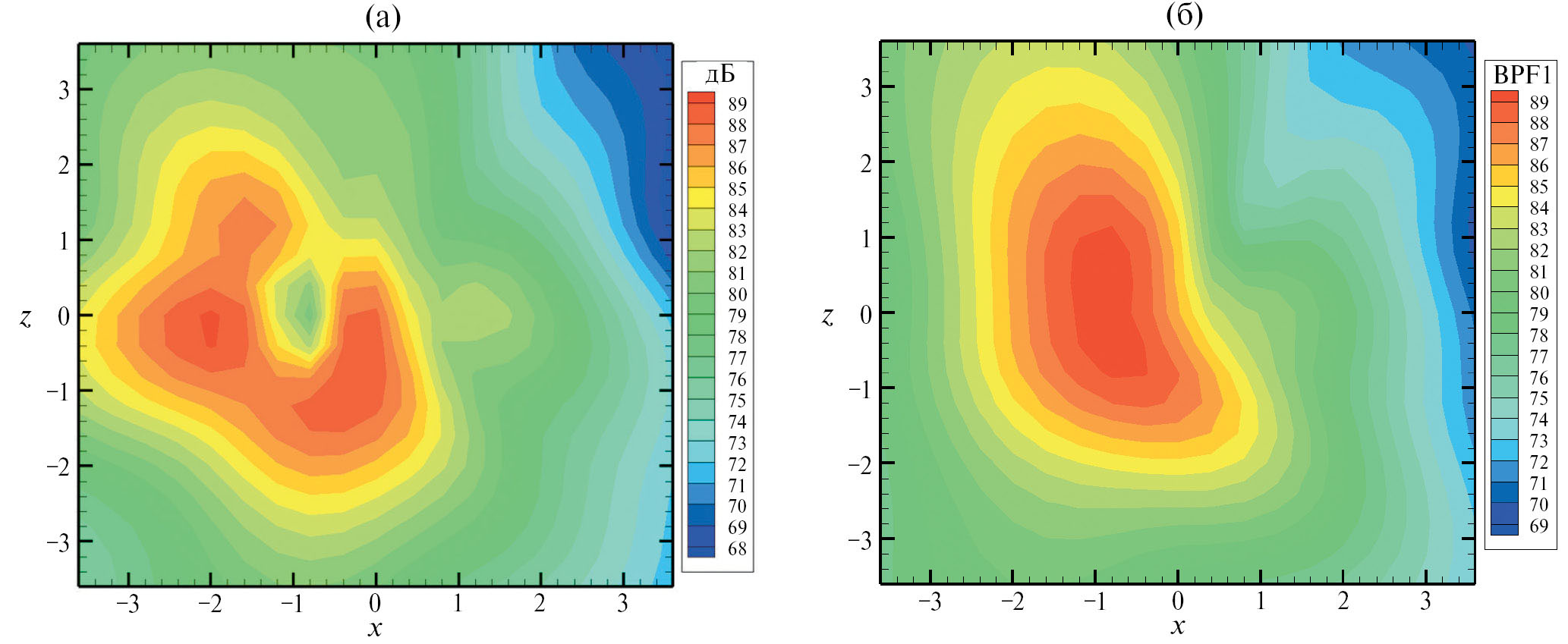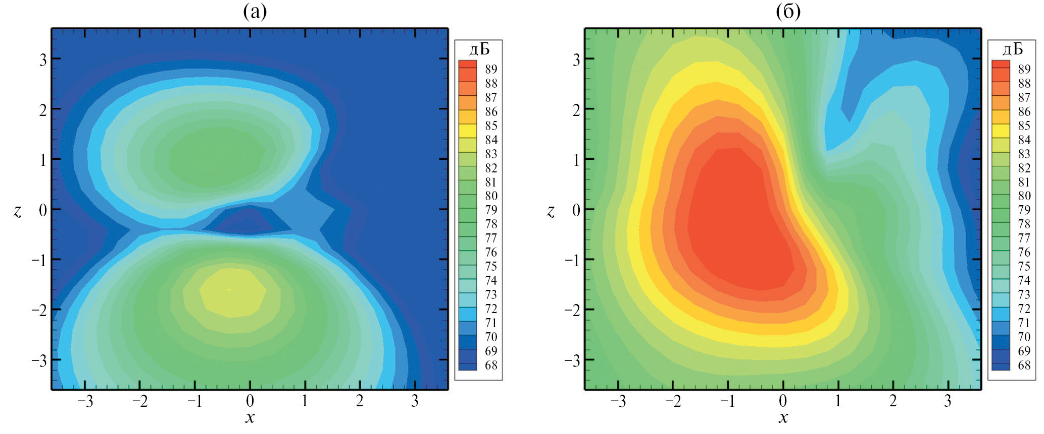 Рис. 2а показывает, что звуковое поле, генерируемое модельным источником, имитирующим шум нагрузки изолированного двухлопастного винта, обладает, как и положено, свойством боковой симметрии, т.е. симметрией относительно оси х. При этом диаграмма направленности поля модельного изолированного винта содержит два максимума: наиболее интенсивный в задней полусфере с координатами xv = –1 м, zv = 0 и менее интенсивный в передней полусфере с координатами xv = 1.6 м, zv = 0. Рис. 2б показывает, что геометрическое экранирование дискового источника, определяемое первым членом в выражении (10), приводит к боковой асимметрии звукового поля в зоне частичной тени согласно механизму, описанному в [9], в результате чего максимум излучения в этой зоне смещается на плоскости наблюдения в точку с координатами xv = –0.6 м, zv = –0.6 м.