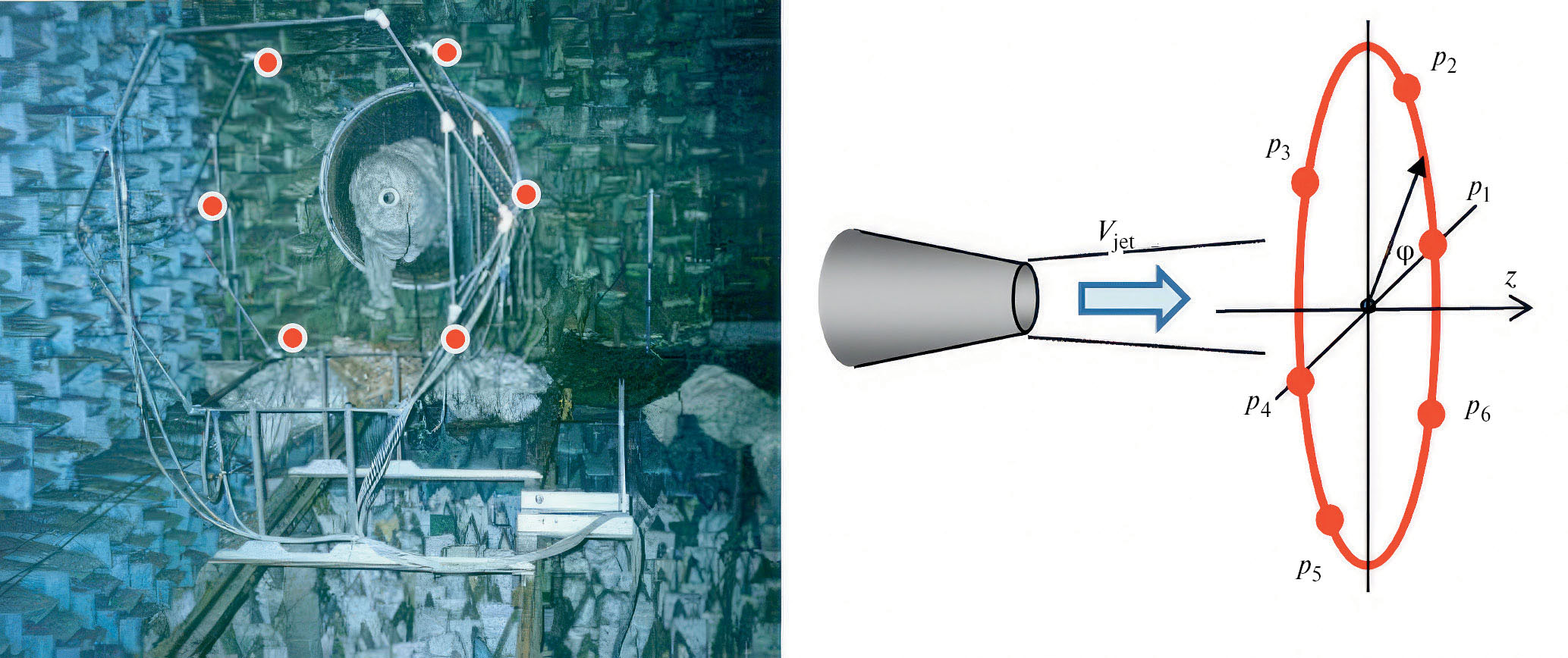 Используемые в настоящей работе данные акустических измерений были получены методом ADT. Этот экспериментальный метод был впервые предложен в [10] специально для измерения азимутальных компонент звукового излучения аэродинамических источников шума. Схема эксперимента в заглушенной камере АК-2 ЦАГИ представлена на рис. 1.