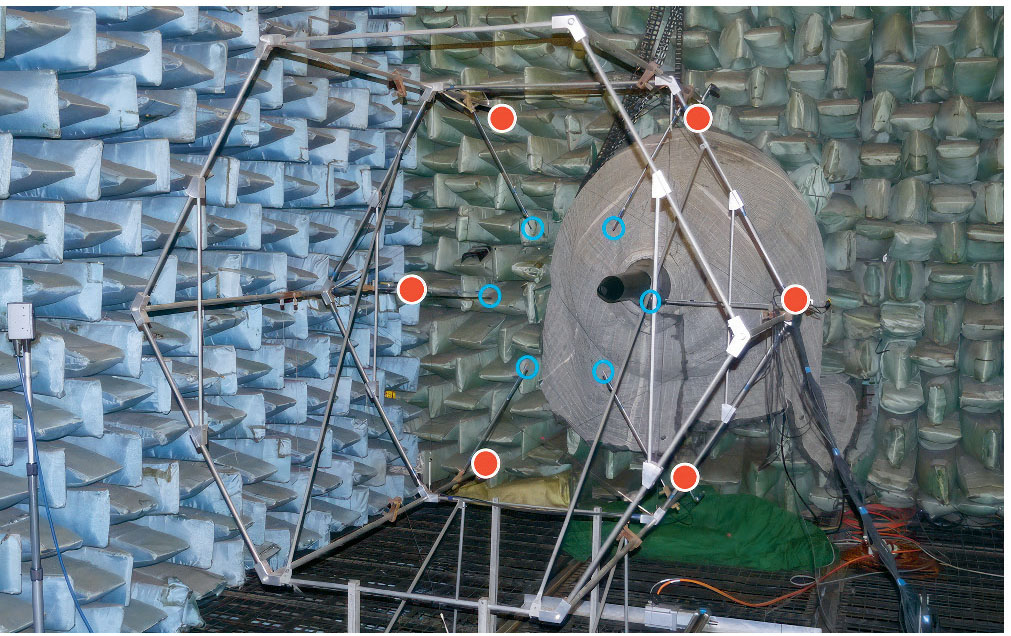 Рис. 2. Эксперимент с микрофонными решетками двух радиусов (положения микрофонов на фотографии отмечены маркерами)