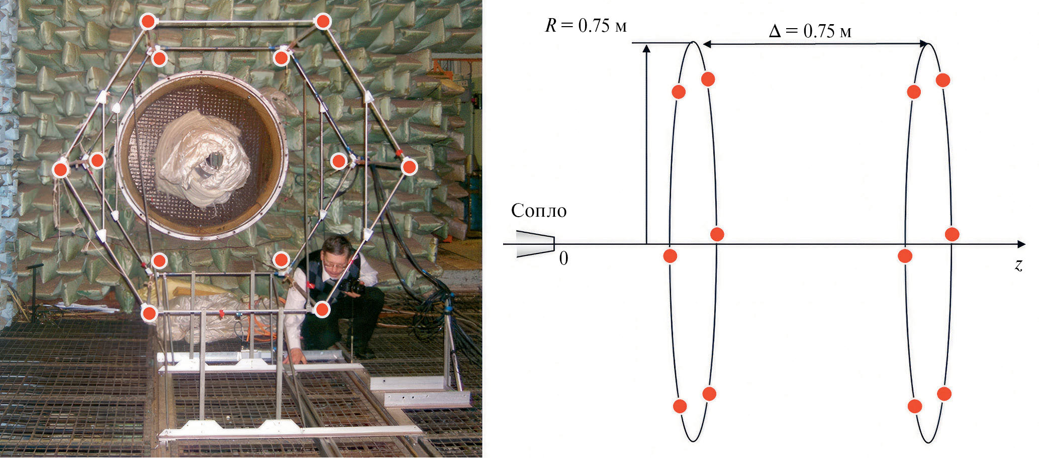 Другая серия экспериментов состояла в синхронных измерениях на двух решетках радиуса R = 0.75 м, расположенных на расстоянии Δz = 0.75 м друг от друга (рис. 3) [13]. В этих измерениях определялись пространственные (по осевой координате) корреляции азимутальных гармоник звукового поля струи. Важность измерений этих величин в том, что они оказались достаточно чувствительным инструментом для оценки распределения звуковых источников вдоль оси струи.