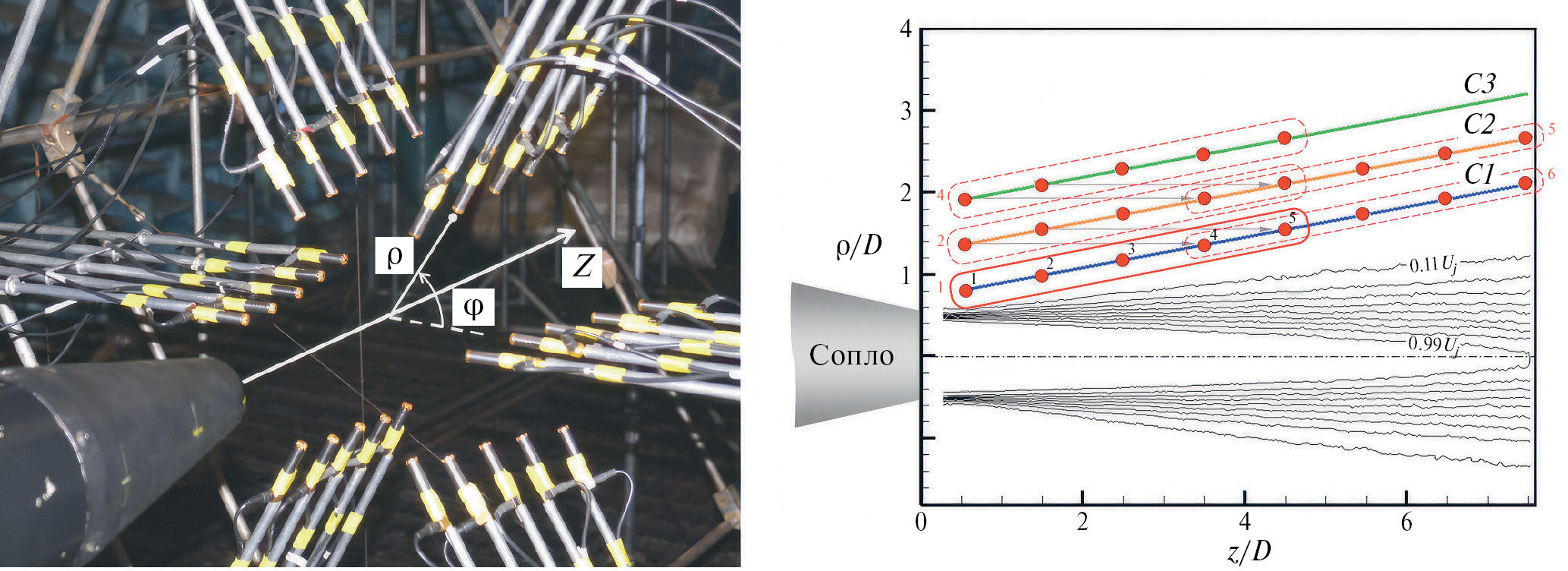 Еще одна серия измерений была проведена на границе акустического и псевдозвукового поля струи [14]. Для этого была использована система из пяти 6-микрофонных подвижных решеток, заметающих область ближнего поля от границы слоя смешения до расстояний от оси струи ρ / D ~ 2.5 в пределах начального участка 0.5 ≤ z/D ≤ 7.5 (рис. 4). С помощью этих измерений может быть проведена оценка границы применимости модели квадрупольных источников для моделирования пульсаций давления в ближнем поле. Кроме этого, измерения в непосредственной близости от струи дают наиболее детальную информацию о распределении источников в струе.