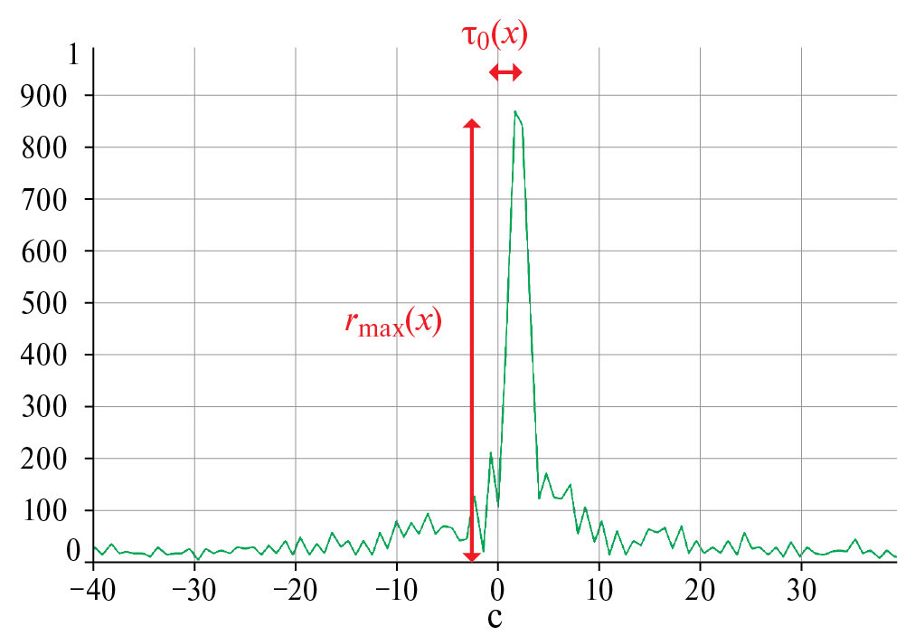 На рис. 9 представлен пример модуля взаимной корреляции гармоник на двух решетках. Видно, что корреляция достигает максимума при τ = τ0, что соответствует разнице времени достижения сигнала от источников до каждой из двух решеток. Заметим, что в узкой полосе частот нормированный максимум взаимной корреляции (10) представляет собой нормированный модуль взаимного спектра