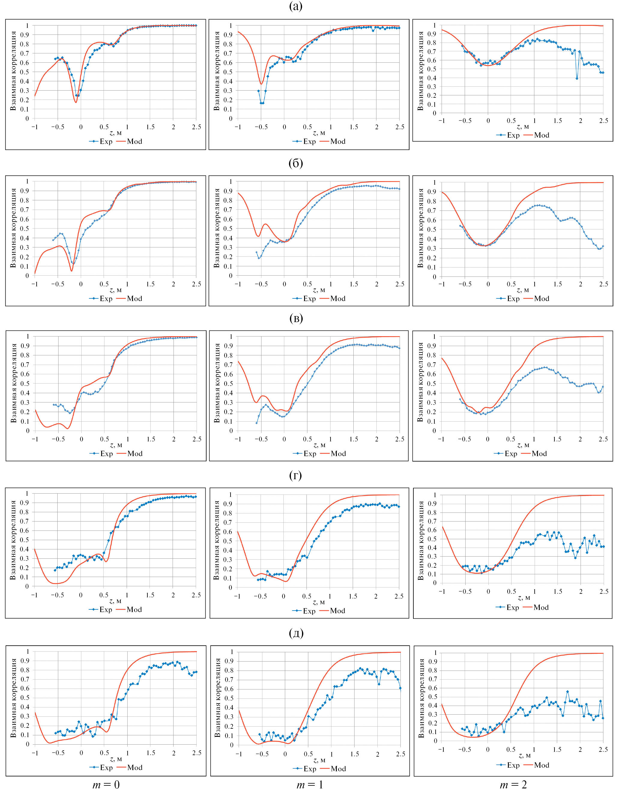 Для расширения применимости модели источников звука на область ближнего акустического поля необходимо учитывать распределение источников вдоль оси струи. С этой целью были использованы данные синхронных измерений звукового поля на двух 6-микрофонных решетках радиуса R = 0.75 м (рис. 3), расположенных на расстоянии Δz = 0.75 м друг от друга, в зависимости от их расстояния до сопла. Проведена оценка нормированного значения максимума взаимной корреляции азимутальных гармоник на этих решетках