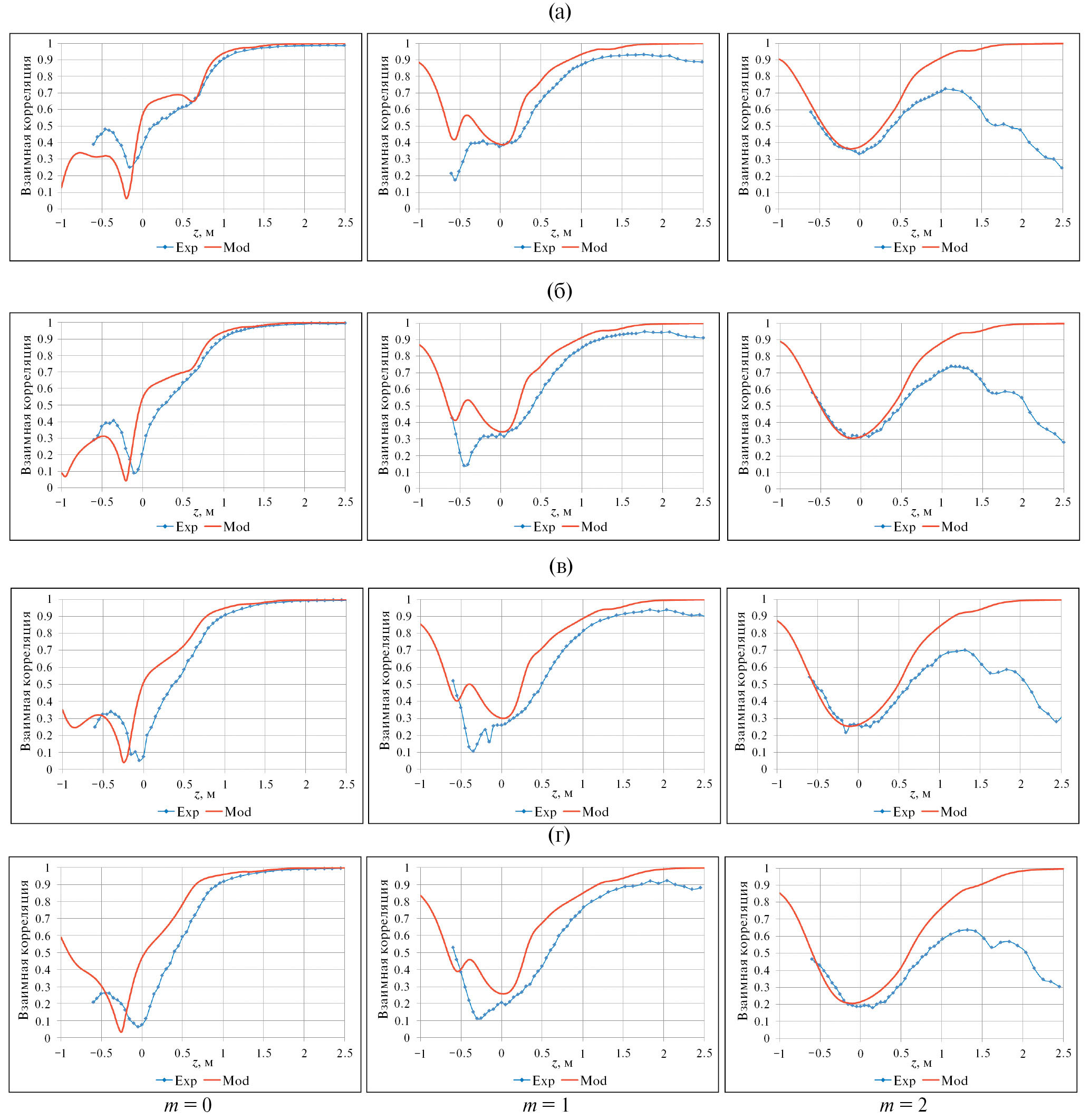 Рис. 11. Взаимная корреляция rmax для азимутальных гармоник m = 0,1,2, (а) — Vjet = 100 м/с, St = 0.32, (б) — Vjet = 135 м/с, St = 0.24, (в) — Vjet = 180 м/с, St = 0.18, (г) — Vjet = 240 м/с, St = 0.13