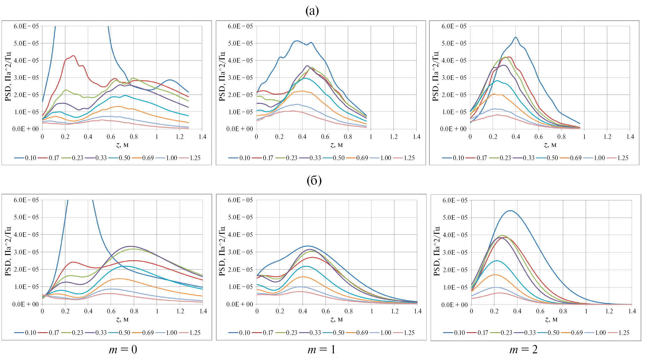 Для определения мощности квадрупольных источников в струе и соотношения амплитуд между различными квадрупольными компонентами были использованы данные 6-микрофонной решетки радиуса R = 0.85 м (рис. 1). С помощью метода азимутальной декомпозиции (ADT) получены спектральные характеристики отдельных азимутальных гармоник в дальнем акустическом поле струи.