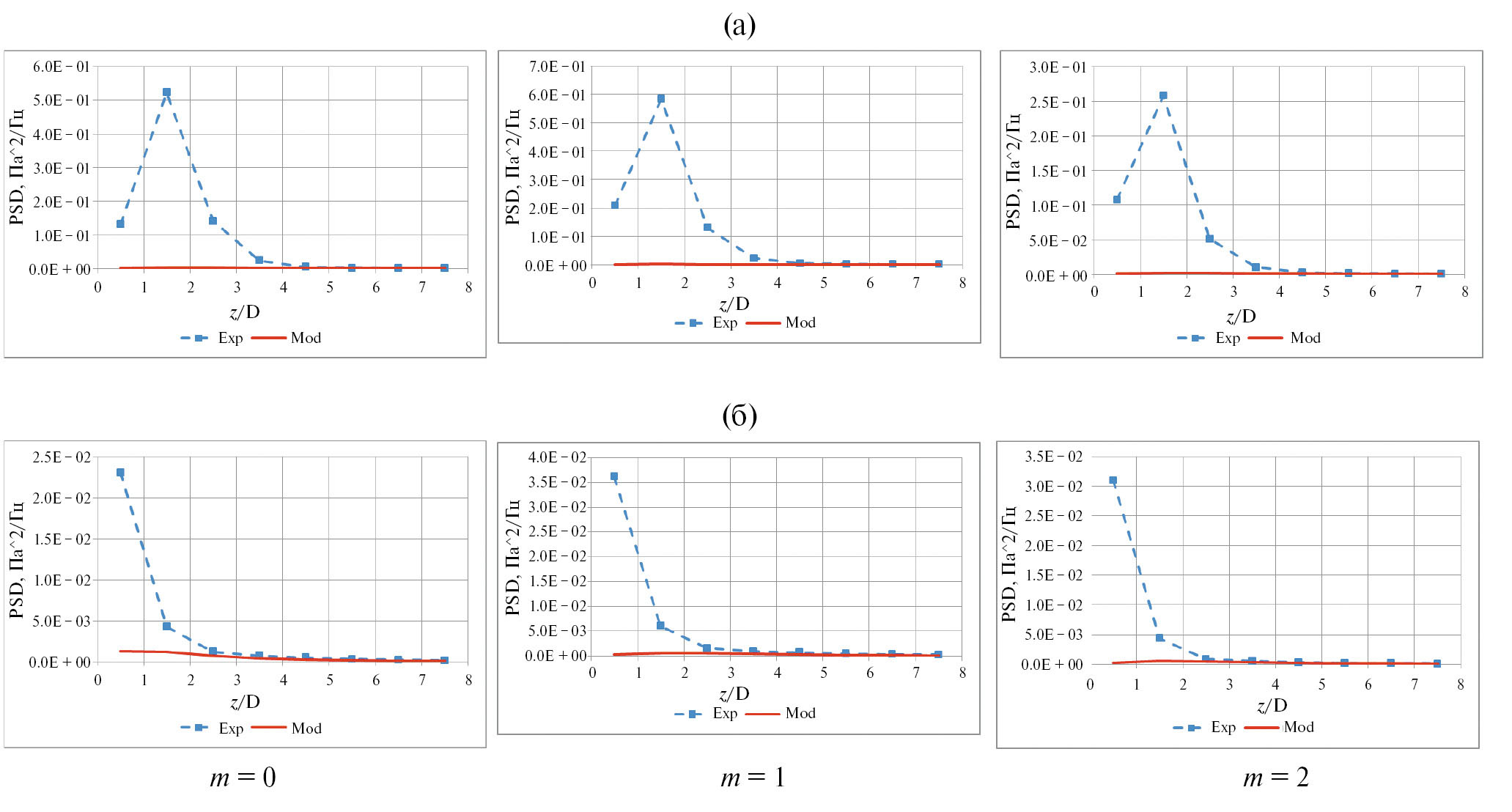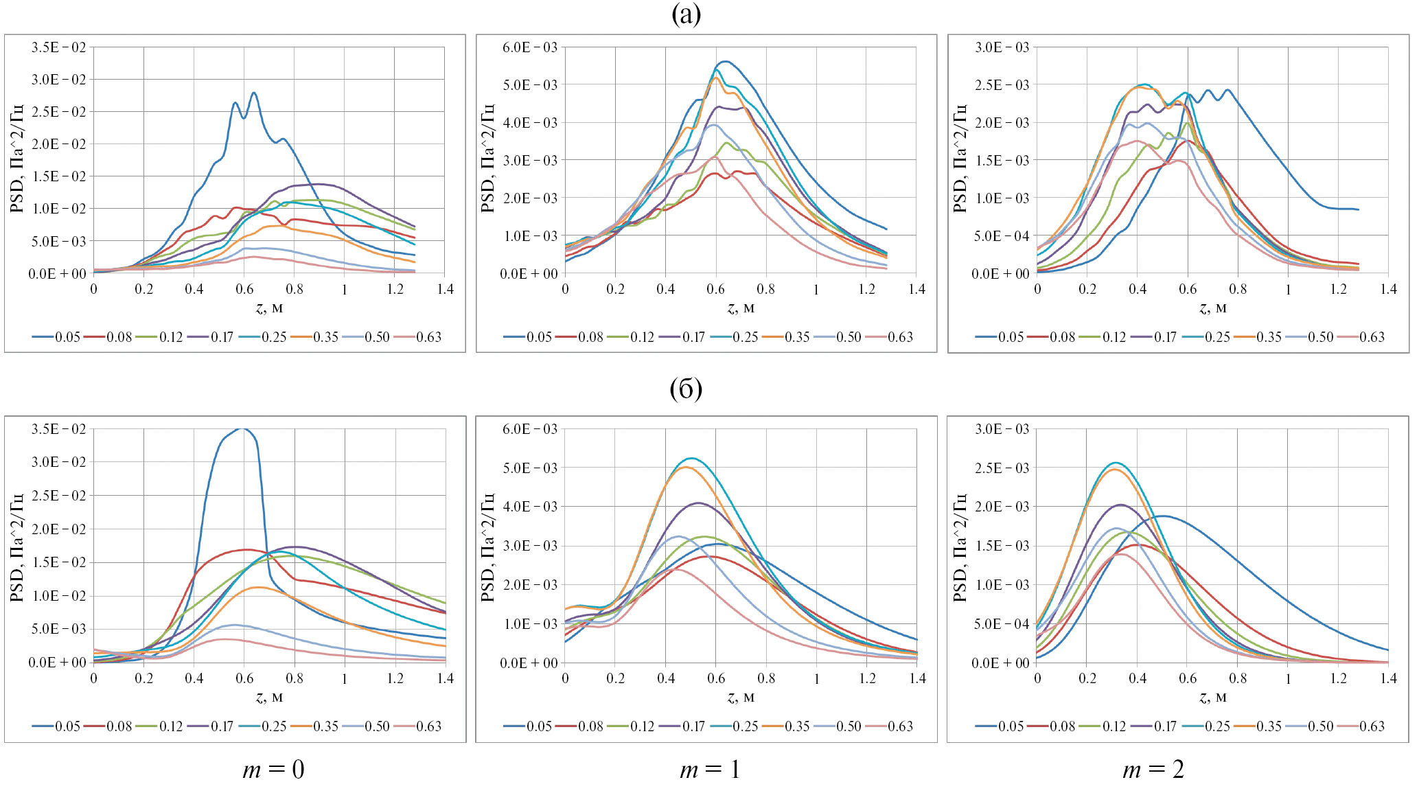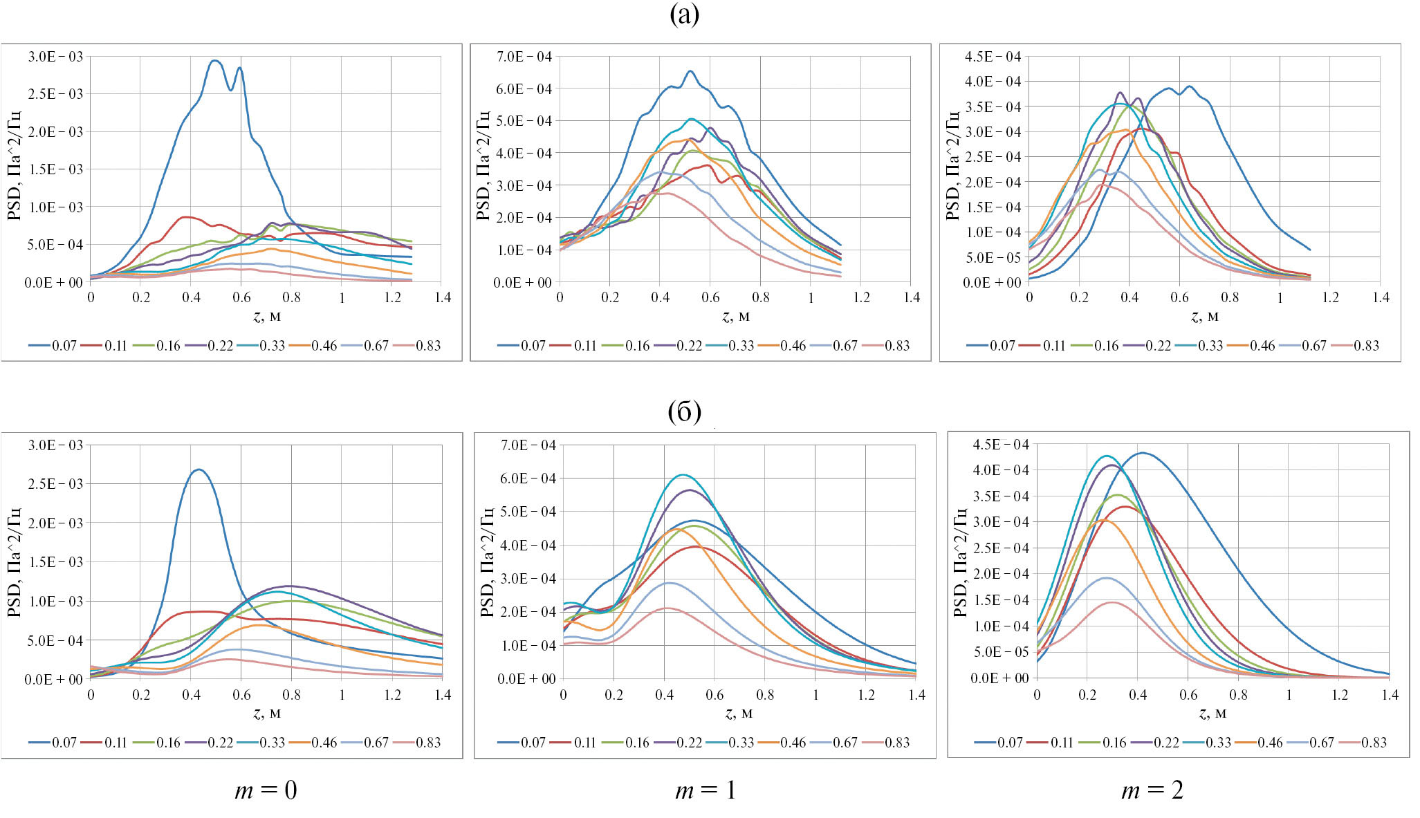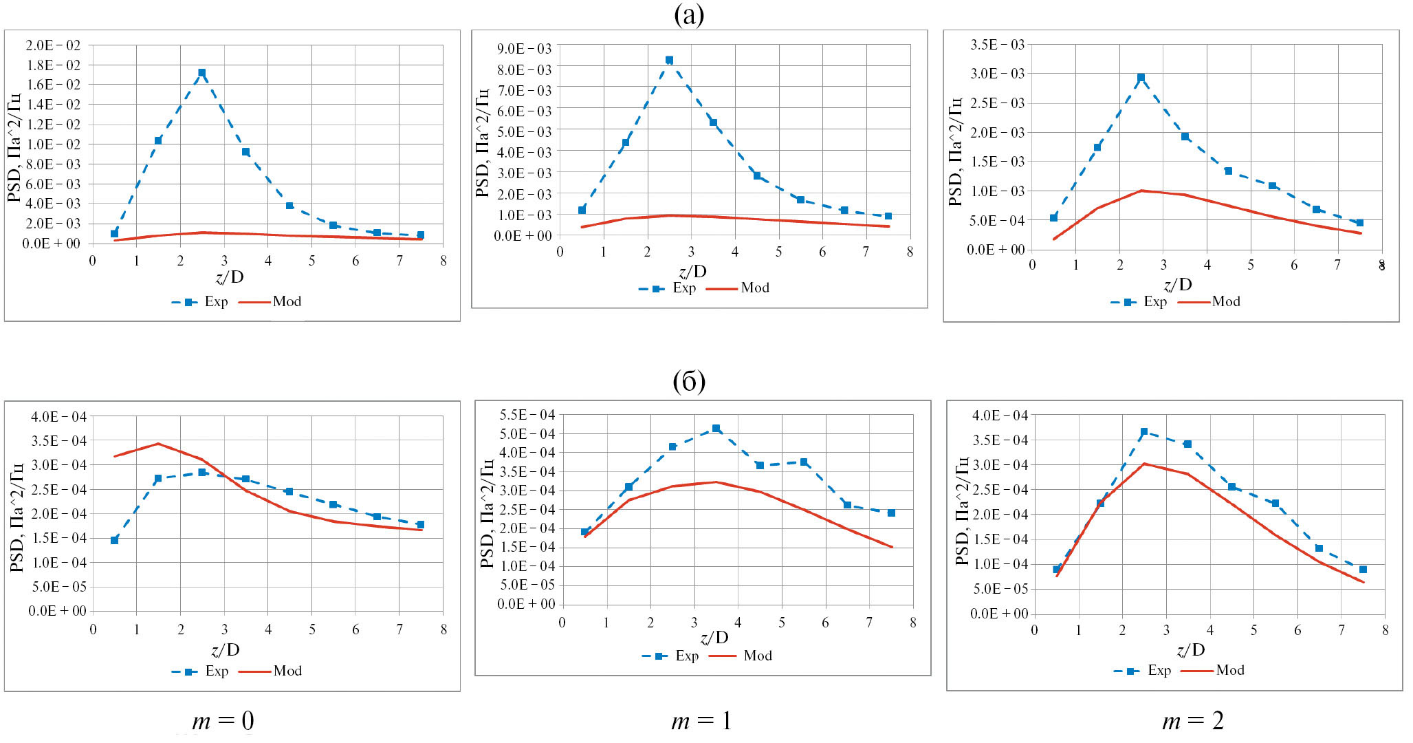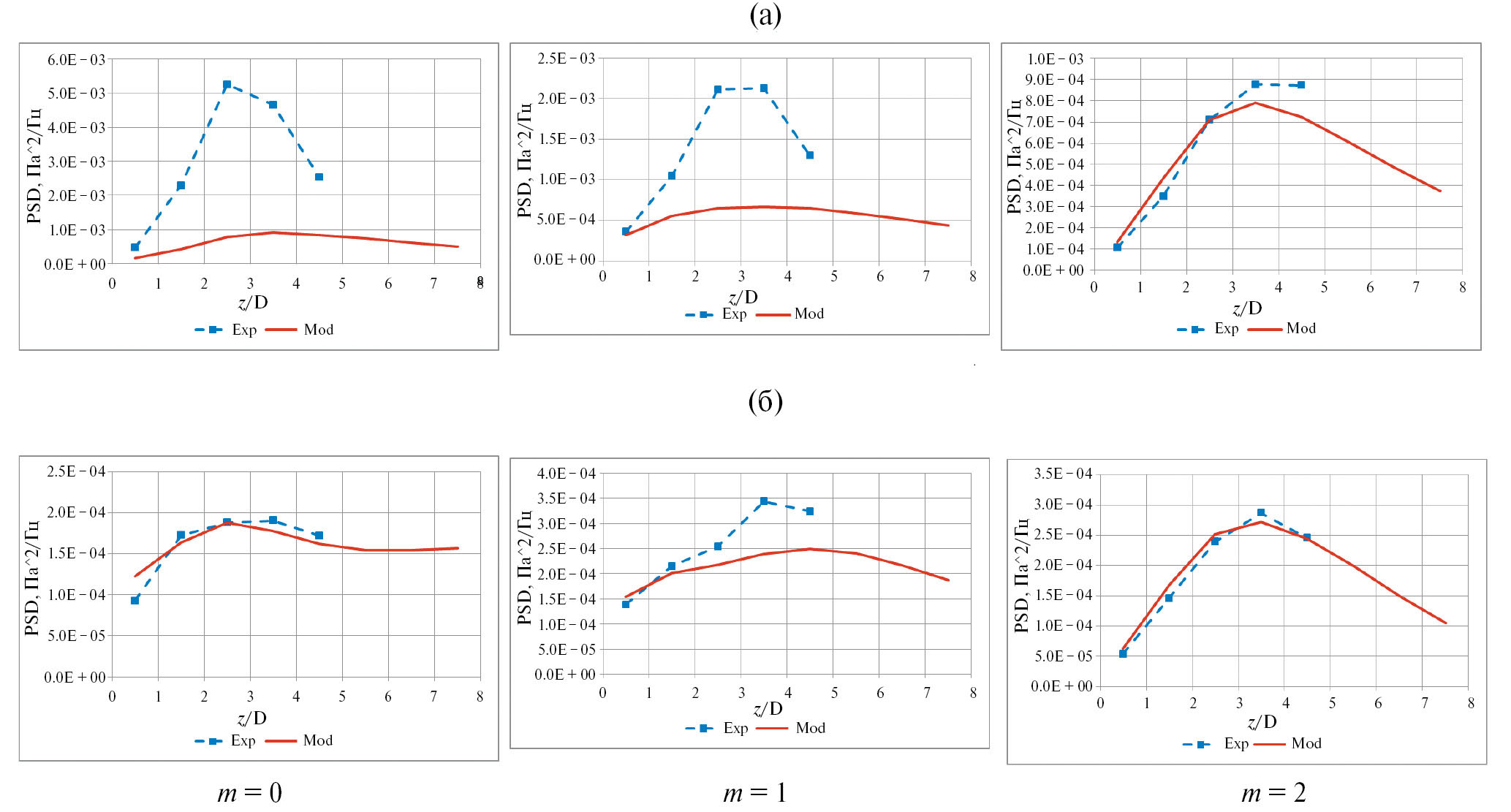 Сравнение модели с данными измерений представлено на рис. 5–8, где приведены спектральные плотности азимутальных гармоник m = 0, 1, 2 в диапазоне частот 0.04 < St < 1.25, St = fD / Vjet, и скоростей 120 < Vjet < 280 м/с.