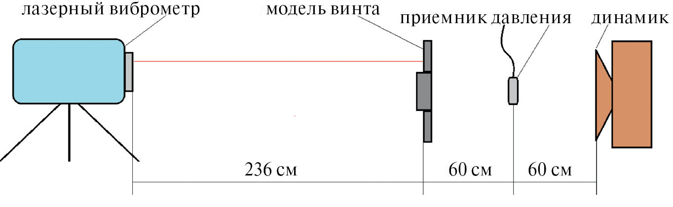 Верификационный эксперимент на воздухе выполнялся в безэховой камере (для устранения влияния реверберации), внутри которой винт подвешивался на мягких тросах. Для возбуждения колебаний винта использовался акустический динамик, работающий в широкой полосе (генерировался полосовой шум), для измерения отклика — лазерный виброметр Polytec VibroFlex, осуществлявший последовательные замеры вибрации (рис. 2). Рабочая полоса частот лазерного виброметра заведомо шире необходимой для данной работы и ограничена 100 кГц.