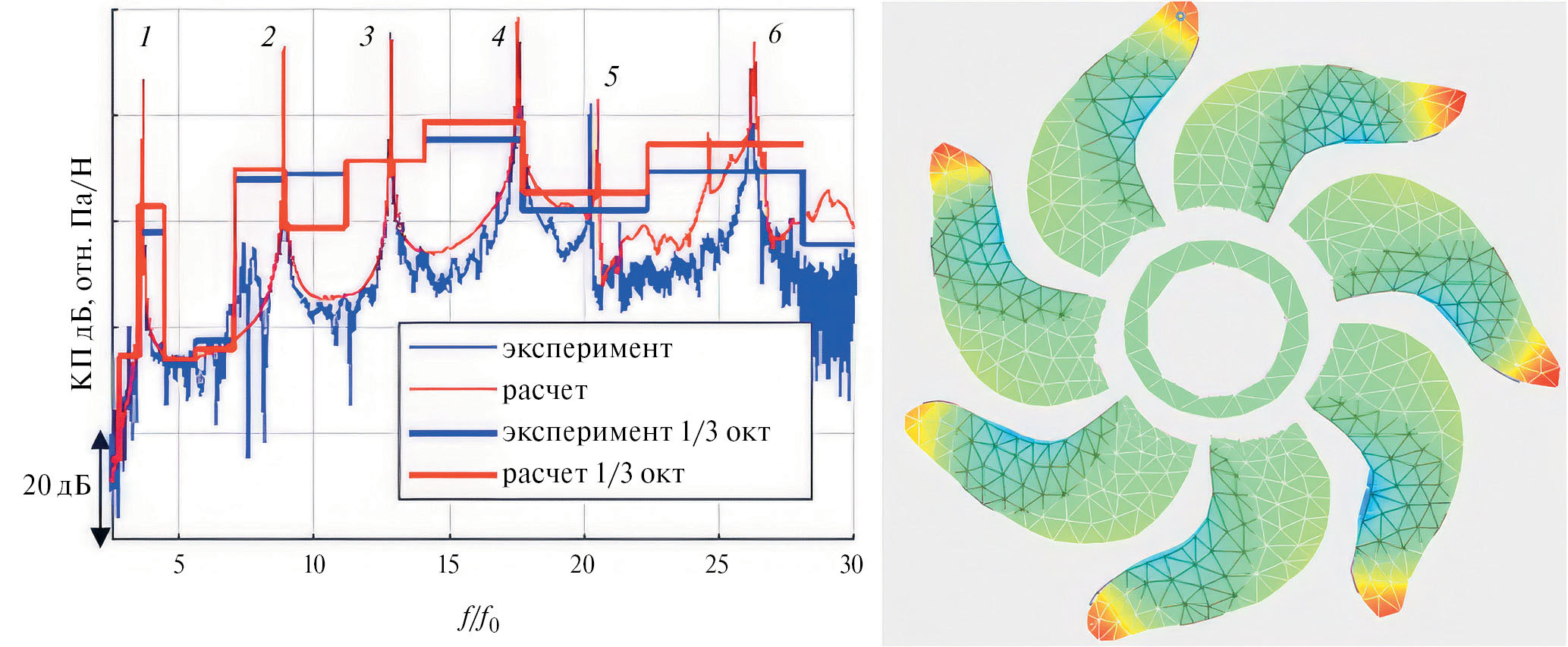Рис. 3. Сравнение узкополосных и третьоктавных спектров расчетных и экспериментальных коэффициентов передачи в воздухе. Тонкие кривые — узкополосные коэффициенты, толстые кривые — коэффициенты в третьоктавных полосах. Цифрами обозначены номера синфазных мод лопастей. На картинке справа изображена экспериментальная форма колебаний № 3