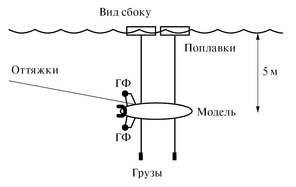 Экспериментальные исследования акустического поля винта проводились на полигоне в заливе Ладожского озера (рис. 1). Глубина акватории в районе измерений составляла порядка 20 м, размеры акватории порядка сотен метров. Вращение винта обеспечивалось электродвигателем подводного аппарата. Измерения выполнялись на стоповом режиме (рис. 4), для этого подводный аппарат с помощью системы грузов, оттяжек и поплавков фиксировался таким образом, что центр винта находился на глубине 5 м. К вертикальным стабилизаторам через поролоновые проставки с целью снижения влияния вибраций корпуса прикреплялись два гидрофона для регистрирации давления.