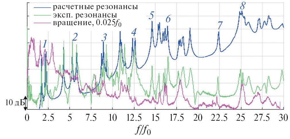 Рис. 7. Сравнение резонансов гребного винта, возбуждаемых в расчете, с результатами измерений при вращении вала с частотой 0.025 f0 Гц. Цифрами отмечены синфазные моды для каждой формы колебаний