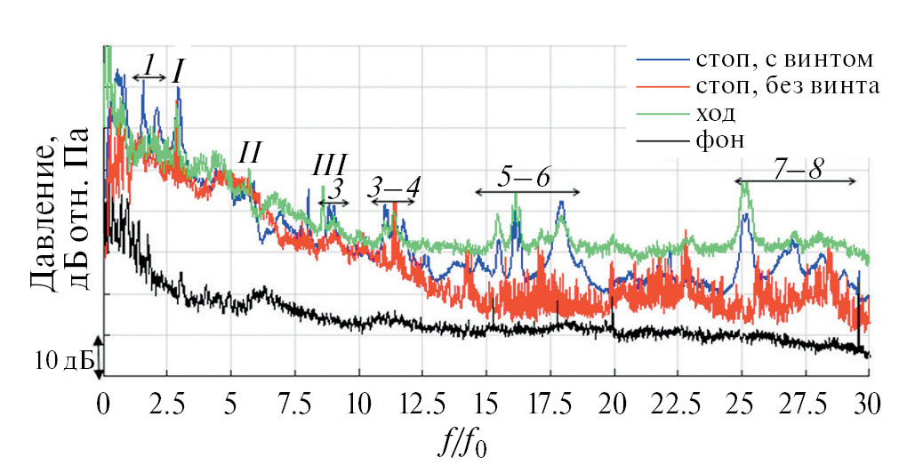 Для ходового режима имеется похожий набор максимумов, как и на стоповом режиме, который обусловлен влиянием резонансов лопастей винта. В диапазоне частот выше 4-й формы колебаний, наблюдается повышение фона между резонансами по сравнению со стоповым режимом, из-за воздействия потока. Некоторые максимумы могут скрываться под этим шумом. Заметим, что на ходу существенно понизилась амплитуда низкочастотных резонансов. Это может быть связано с тем, что важным источником возбуждения лопастей являются колебания двигателя и валопровода, которые на стопе более виброактивны. Косвенным образом эта гипотеза подтверждается сравнением графиков с ударным возбуждением резонансов прикрепленного к модели винта (рис. 7, зеленая кривая) и графиков с вращением винта (например, фиолетовая кривая на рис. 7). При вращении винта на стоповом режиме в низкочастотном диапазоне присутствует широкий максимум (от 0 до 5f / f0), в то время как на резонансной кривой, когда двигатель не работал, его нет. Следовательно, этот максимум является вкладом от возбуждения работающим приводом. На стопе движитель работает нештатно, поскольку не обеспечивается проектная поступь винта, что приводит к турбулизации потока и соответствующему увеличению сил, возникающих на винте и валу, относительно ходовых режимов. На ходовом режиме и на стопе можно выделить острый максимум, частота которого зависит от оборотов и его гармоники (отмечены римскими цифрами на рис. 8). Эти максимумы не относятся к резонансам лопастей и, по-видимому, вызваны вибрациями привода.
